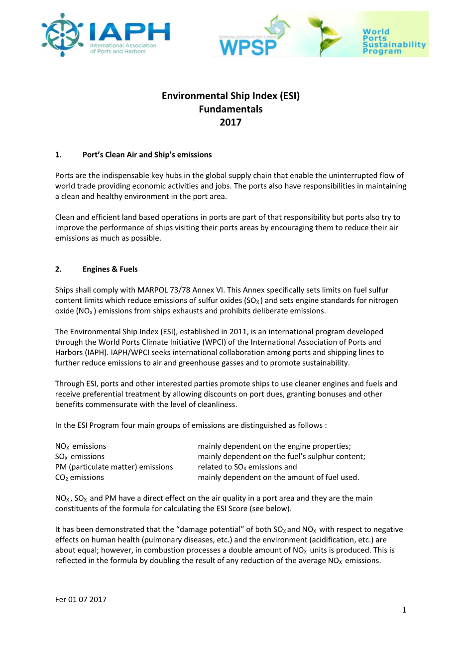 环境船舶指数(ESI)成立于2011年,是通过国际港口协会(IAPH)的世界港口气候倡议组织(WPCI)制定的一个国际项目。IAPH/WPCI寻求港口和航运公司之间的国际合作,为了进一步减少污染气体和温室气体的排放,并促进可持续发展。