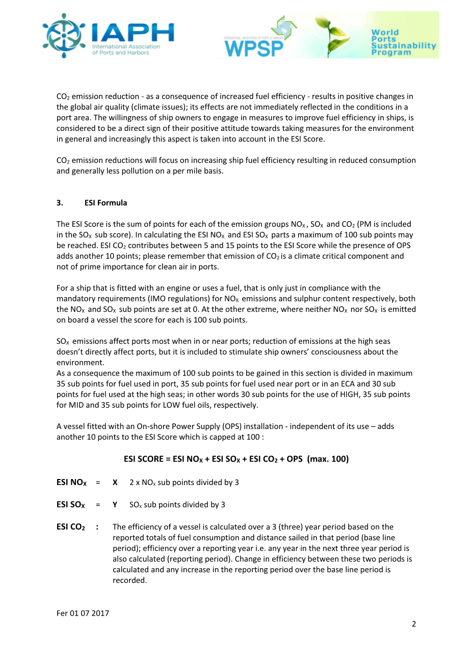 由于燃料燃烧效率的提高,二氧化碳排放的减少导致了全球空气质量(气候问题)出现了积极变化;它的影响不会立即反映在港口区域的环境条件上。船东愿意采取措施提高船舶燃油的燃烧效率,被认为是他们对总体环境采取措施的积极态度的直接标志,并且ESI的分数也越来越多地考虑到这方面。
