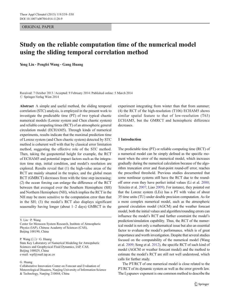 上述误差限方法可以应用于对一个动力系统的RCT/PT的整体和局部的单变量研究。此外,小的delta;0,数值模拟和理论的相关分析结果证实,基于上述方法的一个动态系统的RCTs显示相似的结果,和RCT/ PTs的个体变量和整个系统非常接近。针对上述方法费时、系统依赖等局限性,本文提出了一种简单实用的时间滑动相关法(STC),用于研究动态系统的RCT/PT和复杂AGCM;下面将介绍STC方法的简介和优点。