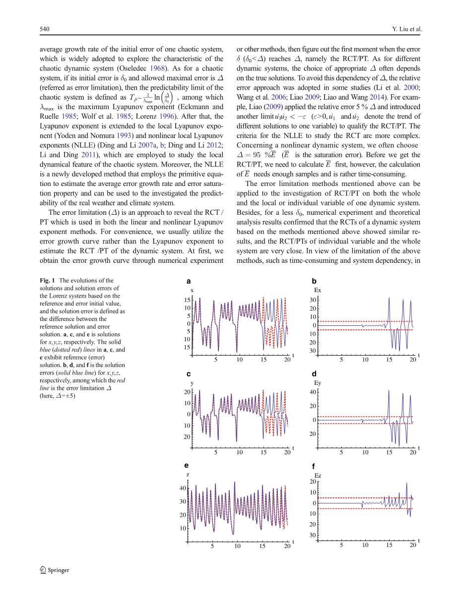 误差限(Delta;)是一种用来揭示RCT/ PT用于线性和非线性Lyapunov指数的方法。为了方便,我们通常使用误差增长曲线而不是Lyapunov指数来估计动力系统的RCT /PT。首先,我们通过数值实验或其他方法获得生长曲线误差,然后找出误差delta;(delta;0 lt;Delta;)到达Delta;的第一个时刻,即RCT/ PT。对于不同动力系统,选择合适的Delta;往往决定了真正的解。Delta;避免了解的这种依赖性,相对误差的方法是采用一些研究(Li et al . 2000;Wang et al. 2006;Liao 2009;Liao 和Wang 2014)。例如,Liao(2009)应用Delta;相对误差5%,引入另一个极限u1 * u2 lt;minus;ε(εgt; 0,u1和u2表示同一个变量的趋于不同的解)有RCT/ PT。NLLE研究RCT的标准更加复杂。在非线性动态系统中,我们经常选择Delta;= 95%(为饱和误差)。在我们得到RCT/PT之前,我们需要先计算,但是计算需要足够的样本,非常耗时。
