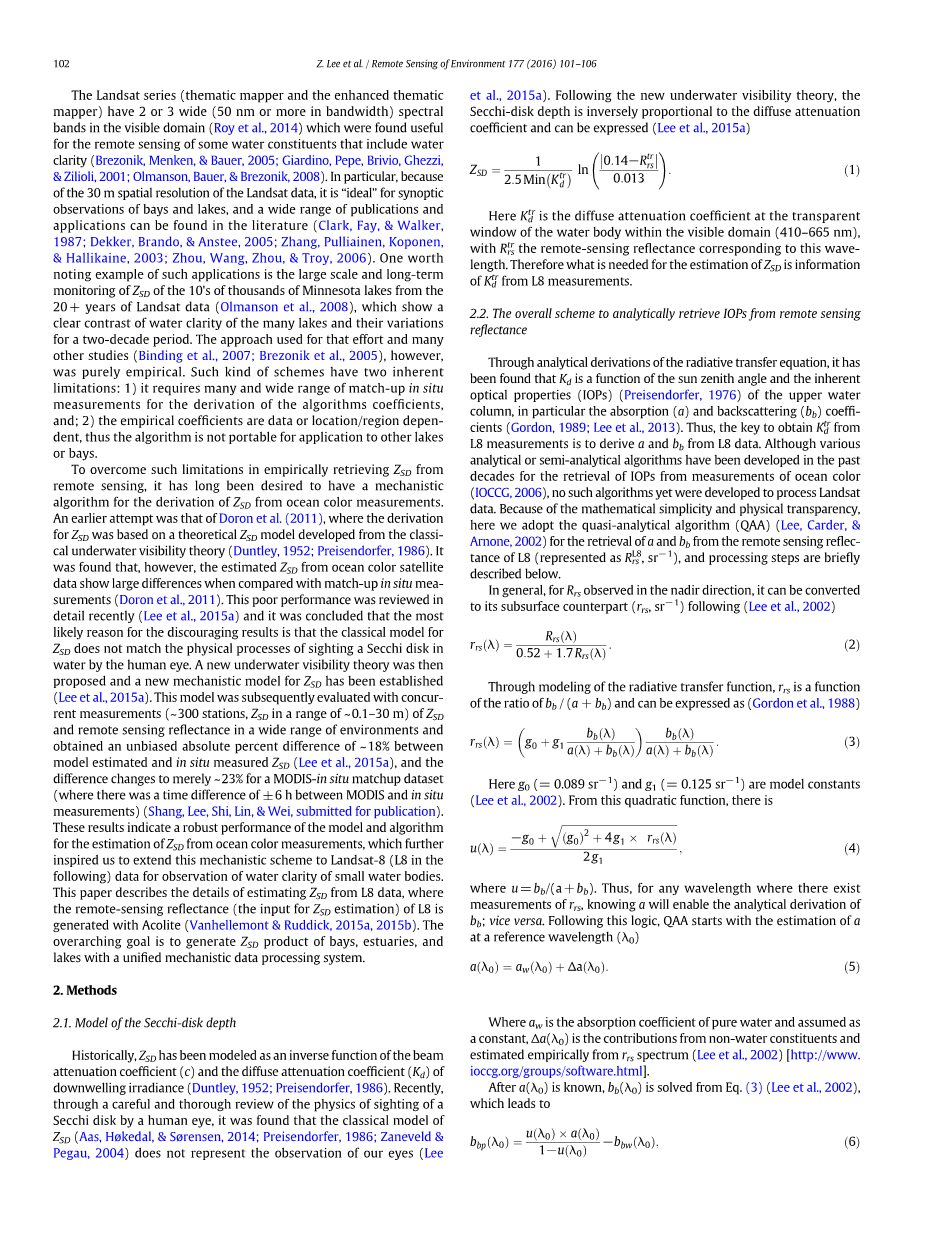 为了克服从遥感中经验检索ZSD的这种限制,长期以来一直希望有一种从海洋水色测量推导ZSD的机械算法。早期的尝试是Doron等人的尝试,其中ZSD的推导是基于从经典水下能见性理论开发的理论ZSD模型(Duntley,1952;Preisendorfer,1986)。然而,发现与海洋水色卫星数据相比,估计的ZSD显示出较大的差异(Doron等,2011)。这个糟糕的表现最近被详细地检查(Lee等,2015a),并得出结论,这种令人沮丧的结果最有可能的原因是ZSD的经典模型与肉眼观察水中赛氏盘的物理过程不符。随后提出了一种新的水下能见度理论,并建立了新的ZSD机械模型(Lee等,2015a)。随后,在宽范围环境下,采用同步测量(约300个站,约0.1-30 m的ZSD范围)和遥感反射率进行评估,得到模型估计值之间的plusmn;18%的无偏差绝对百分比差异并原位测量ZSD (Lee 等,2015a),而MODIS原位匹配数据集的差异仅为〜23%(MODIS和原位测量之间的时差为plusmn;6 h)(Shang, Lee,Shi, Lin, amp; Wei,付梓)。这些结果表明,用于从海洋水色测量中估计ZSD的模型和算法的强大性能,这进一步激励我们将该机制方案扩展到Landsat-8数据,以观察小水体的水清晰度。本文介绍了从Landsat-8数据估计ZSD的细节,使用Acolite生成Landsat-8的遥感反射率(ZSD估计的输入)(Vanhellemont amp; Ruddick, 2015a, 2015b)。总体目标是通过统一的机械数据处理系统生成海湾,河口和湖泊的ZSD产品。