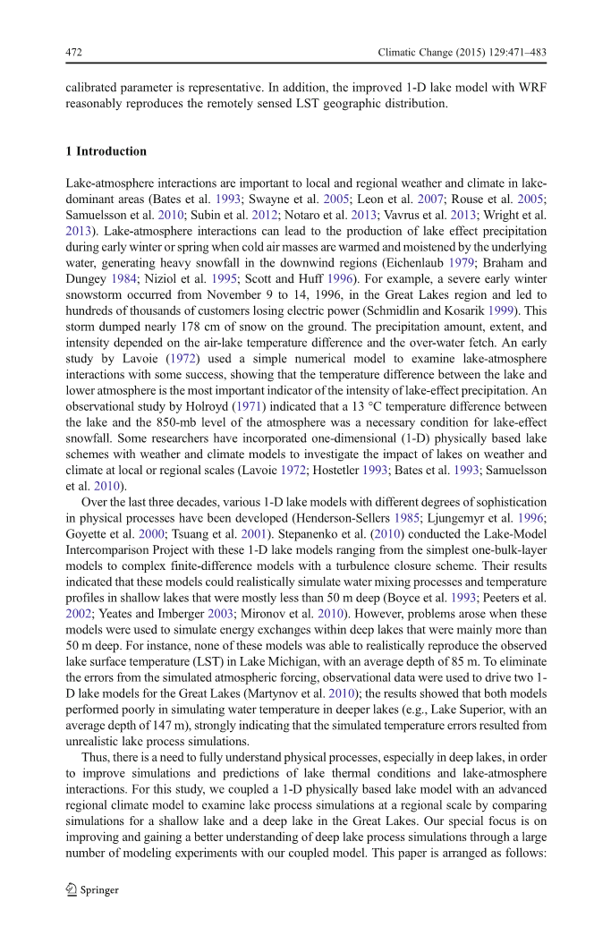 在湖泊主导的区域,湖气间的相互作用对于区域的天气和气候是重要的(Bates et al. 1993; Swayne et al. 2005; Leon et al. 2007; Rouse et al. 2005;Samuelsson et al. 2010; Subin et al. 2012; Notaro et al. 2013; Vavrus et al. 2013; Wright et al.2013)。当冷空气团被底层水湿润时,湖气相互作用可导致湖泊效应降水的产生,并在下风区域产生大量降雪(Eichenlaub 1979; Braham and Dungey 1984; Niziol et al. 1995; Scott and Huff 1996)。例如,五大湖地区在1996年11月9日-14日发生了严重的初冬雪灾,导致成千上万的用户断电(Schmidlin and Kosarik 1999)。这场风暴产生了近178厘米的雪,降水量、范围和强度取决于湖气温差和过水量。Lavoie(1972)的早期研究使用简单的数值模型成功地模拟出湖气之间的相互作用,表明湖泊和低层大气之间的温差是受湖泊影响的降水强度的重要指标。Holroyd(1971)认为受湖泊影响的降雪产生的一个必要条件是湖泊和850hPa大气之间13℃的温差。研究人员已着手于用基于湖泊方案、天气和气候的一维模式来研究湖泊在局部或区域尺度上对天气和气候的影响(Lavoie 1972; Hostetler 1993; Bates et al. 1993; Samuelssonet al.2010)。
