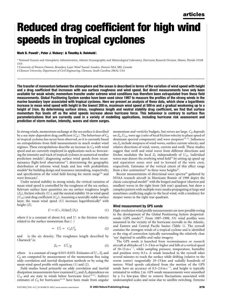 在强风中,海面上的动量交换是由海况相关的拖曳系数(Cd)来描述的。Cd的行为在热带气旋中从未被观察到,所以它目前是基于弱风情况现场测量的外推。这些外推法得到的拖曳系数描述了Cd随风增加而增加的,目前正在应用于诸如:数值天气预报模型中热带气旋的强度和轨迹的预报1;从侦察飞机飞行高度观测来诊断地面风速2,3;分别确定建筑设计和保险费率制定中的极端风负载和损失概率模型的地理分布;以及对风暴潮5,6和波浪预测7情况下风场驱动特性