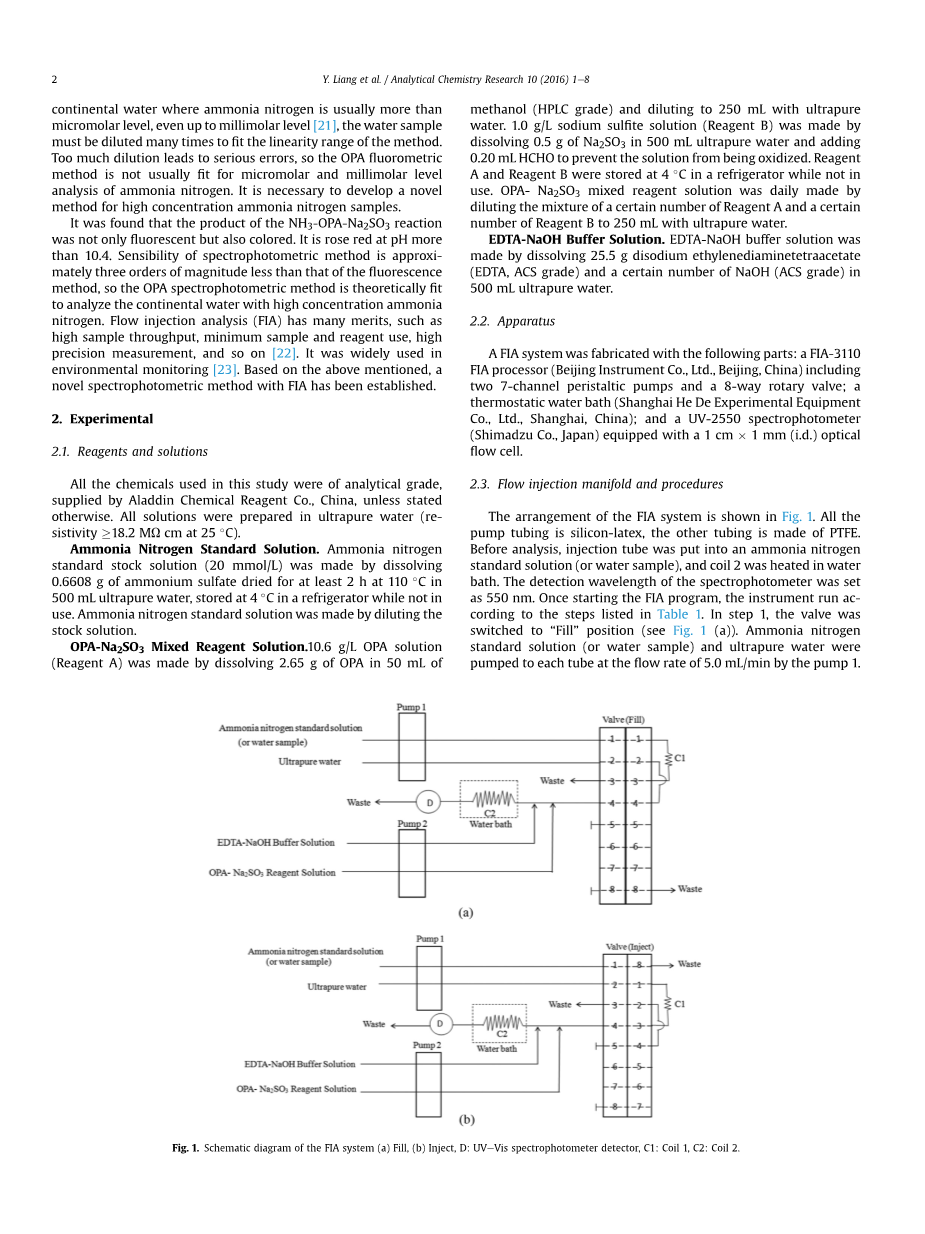 NH3-邻苯二醛(OPA) - Na2SO3反应的产物在pH值大于10.4时呈玫瑰红色,其最大吸收波长为550 nm。运用这个原理,建立了测定水中氨氮含量的新方法。在单变量实验设计的基础上,对实验参数与流动注射方法进行了优化。线圈最优长度为1.6 m,用于存储标准或样品溶液。用于涂色的流速的最优值为8.20 mL/min。实验用的OPA浓度、亚硫酸盐浓度和反应pH分别为1.06 g/L、0.050 g/L和10.80g/L。影响因素主要是反应温度和停止流时间。该方法的线性范围和检测限为0.100—0.700 mmol/L。0.007 mmol/L时最佳的反应温度为55 摄氏度,停止流动时间为340 s。样例吞吐量大于8h-1。在最佳的实验条件下,湖水、河水、地下水和污水的回收率分别为100.4%、95.2%、101.7%和92.4%。用法该方法和靛酚蓝方法对两种湖水样品进行了分析,结果表明两种方法无显著性差异。与其它分光光度法测定氨氮的方法相比,该方法的优点是简单、可靠、重现性好、样品处理量高。