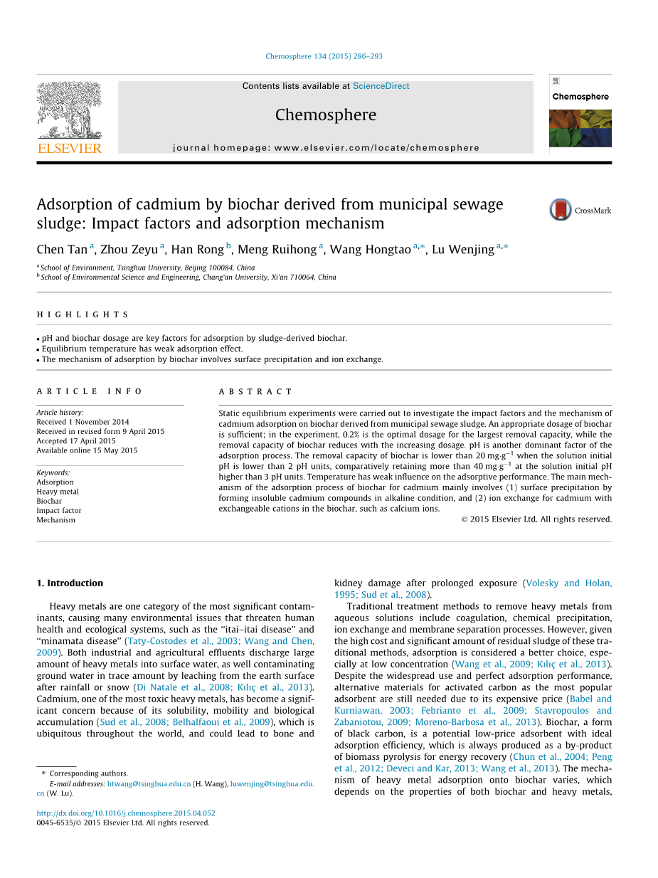 热解是转化生物质残渣的有前途的技术不同来源的污泥,合成气和燃料的生物油,并排放较少的污染物。生物物理干燥过程可以减少污泥含水量具有较少的能量输入,以及良好和松散的颗粒形式从污泥微生物活动;由于更高的热量电导率,经过以下快速热解,合成气含量高获得热值,其由42.6体积%在900℃。我们以前的工作也报道了由上述两步法生成的生物炭对镉的吸附能力比商品高得多活性炭和900 C是两者的最佳温度能量回收和重金属去除(Chen等,2014)。吸附剂用量,溶液pH值和平衡温度均为重要的因素,这可能会强烈影响吸附性能。吸附机理的解决是基础去除过程控制。分析影响因素和影响因素吸附机理是生物炭应用的前提从水溶液中除去重金属。