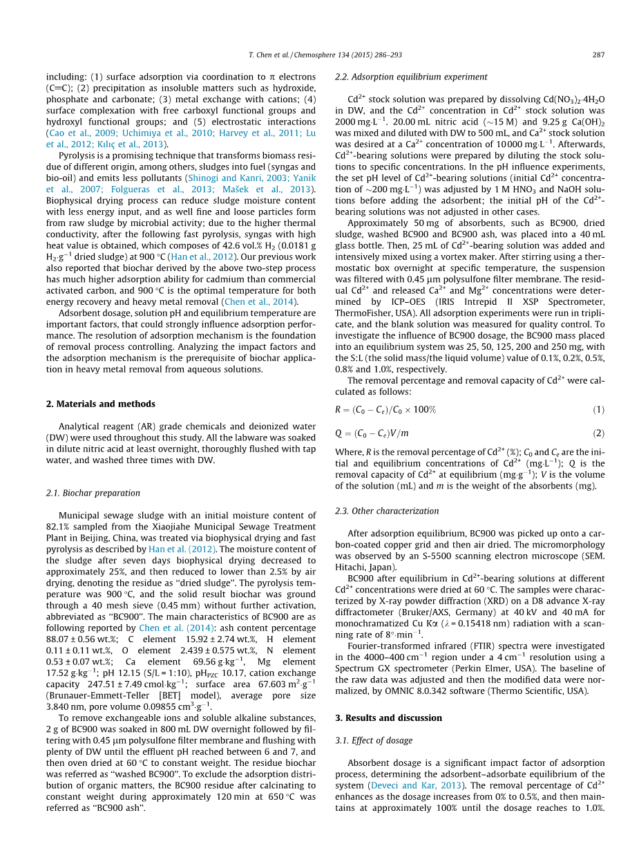 市政污水污泥初始含水量为来自肖家河市污水处理厂的82.1%中国北京的工厂通过生物物理干燥和快速处理如Han等人所述的热解。水分含量生物物理干燥七天后的污泥减少到大约25%,然后通过空气减少到2.5%以下干燥,表示残留物为“干燥污泥”。热解温度是900℃,固体结果是生物炭被磨碎通过40目筛(0.45mm)而无需进一步活化,缩写为“BC900”。 BC900的主要特点由Chen等人报道如下:灰分百分比88.07plusmn;0.56重量%; C元素15.92plusmn;2.74重量%,H元素0.11plusmn;0.11重量%,O元素:2.439plusmn;0.575重量%,N元素0.53plusmn;0.07重量%; Ca元素69.56,Mg元素17.52 ; pH 12.15(S / L = 1:10),pH 10.17,阳离子交换容量247.51plusmn;7.49;表面积67.603,平均孔径3.840纳米,孔体积0.09855。