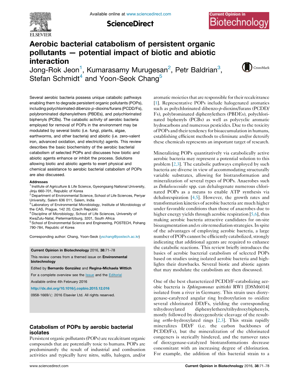 一些好氧菌具有其特有的代谢方式,因此能够降解持久性有机物(POPs),包括二噁英(PCDD/Fs),多溴联苯醚(PBDEs),多氯联苯(PCBs)。利用好氧菌分解代谢以去除环境中POPs,可通过生物添加剂(如真菌、植物、藻类蚯蚓和其他细菌)和非生物添加剂(如零价铁,高级氧化技术和电场)进行调节。本综述描述了好氧菌分解代谢某些POPs的基本生化反应,讨论了生物添加剂和非生物添加剂对该过程的促进和抑制作用。同时讨论了使生物和非生物添加剂充分发挥物理和化学辅助作用,以促进好氧菌分解代谢POPs的方法。