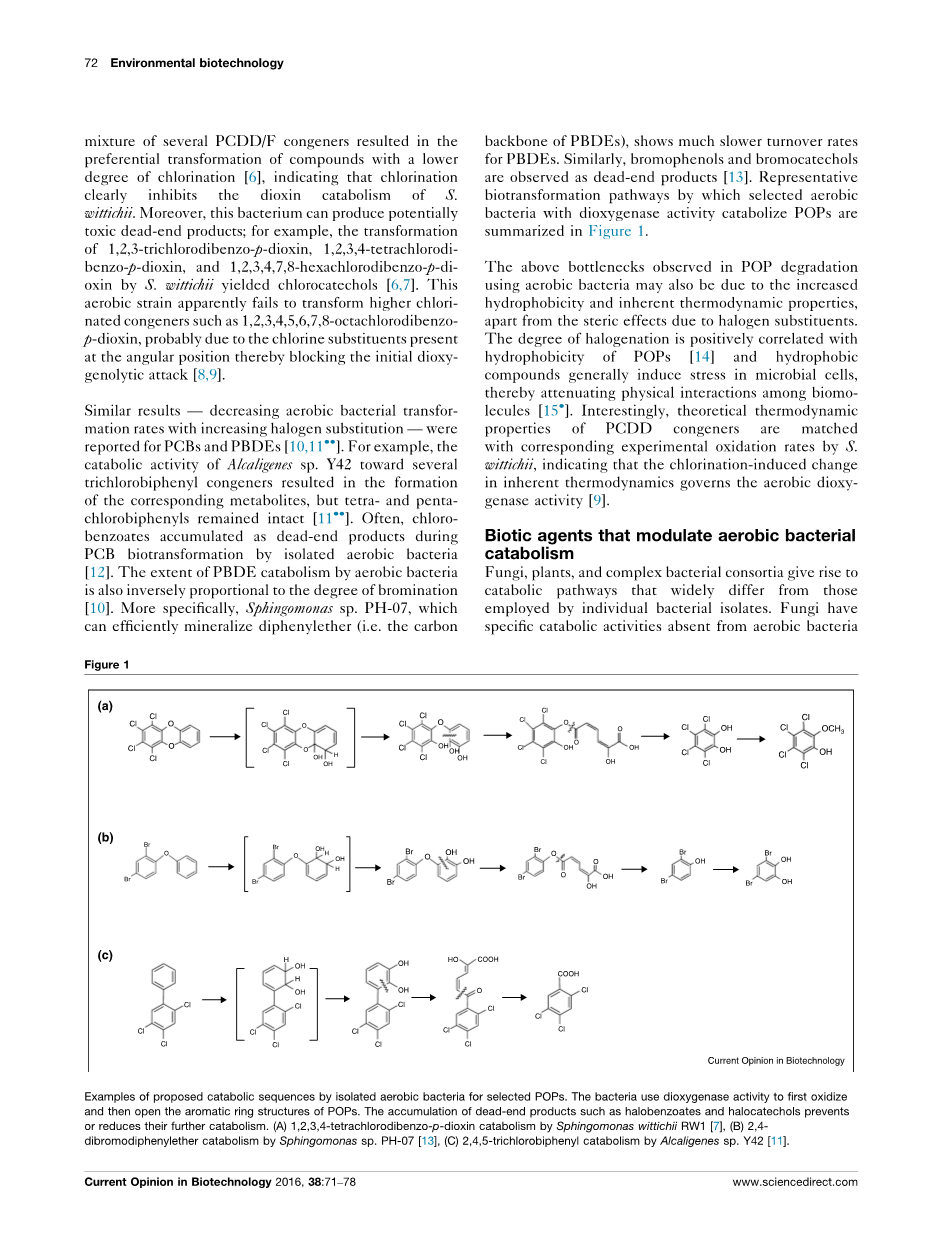 通过具有代谢活性的好氧微生物定量矿化POPs是解决这一问题的一个有效方法[2,3]。这些微生物能适应结构不同的底物,因此代谢方式多样,使得不同类型的POPs得到生物转化和矿化。厌氧菌如Dehalococcoides spp.能够使多种氯化持久性有机物脱卤素,并以此合成ATP[4,5]。然而,由于好氧菌能够通过好氧呼吸产生更高的能量,在适宜条件下,好氧菌的生长速率和转化效率要远高于厌氧菌[5,6],因此,好氧菌在原位生物强化和异位生物修复方面更具优势和吸引力。尽管好氧菌具有多种优点,大量的POPs依然不能得到有效降解,因此需要添加剂来强化代谢过程。本文通过对分离的好氧菌的研究,简要介绍了部分POPs好氧细菌分解代谢的基础知识,并着重指出了它们的缺点,然后讨论了几种可能调节分解代谢的生物和非生物添加剂。