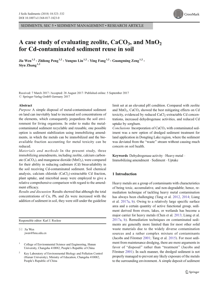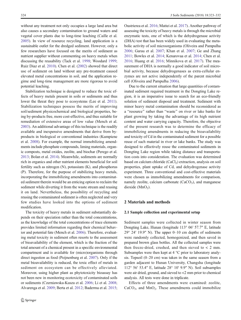 重金属是一类具有毒性、累积性和不可降解性的污染物,因此,治理重金属污染的修复技术一直具有挑战性(Tang等,2012,2014;Liang等,2017a,b)。来自河流、湖泊或湿地的底泥由于比表面积较大并且具有一定数量的活性官能团,已成为重金属的主要载体(Chen等,2013;Liang等,2017a,b)。受污染底泥的修复技术通常比大多数其他固体废物材料受到限制,因为污染源广泛多样且污染物混合物相当复杂(Jacobs and Fouml;rstner,2001;Tang等,2015)。对于大多数维护性疏浚底泥来说,有更多的论点赞成“处置”而不是“处理”(Jacobs and Fouml;rstner,2001)。以这种方式,疏浚底泥没有得到适当的管理以防止金属可能暴露于周围的环境中。