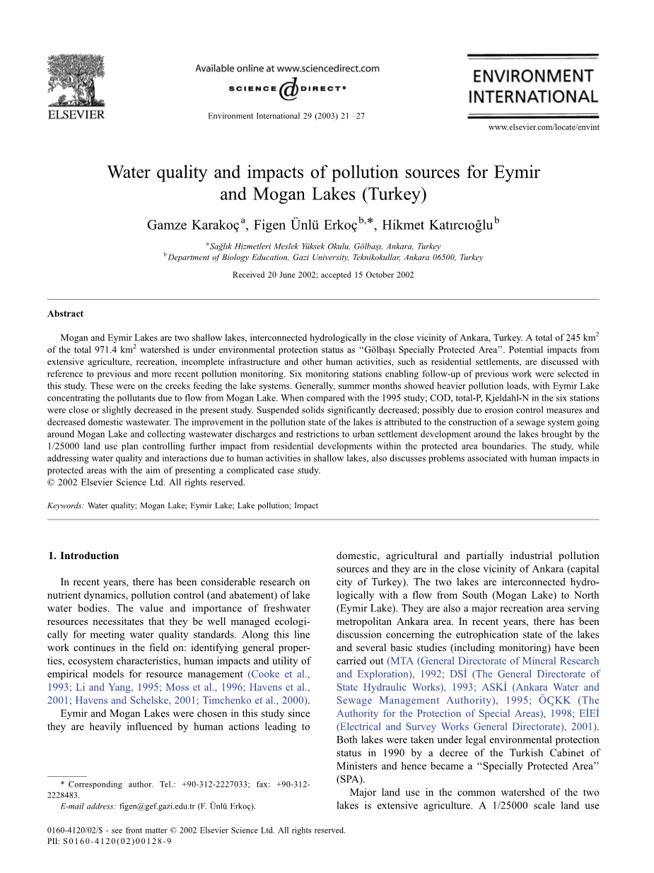 摘要:莫干和伊米尔湖是两个浅湖,在土耳其安卡拉附近的水域中相互连通。总流域面积971.4平方公里内有245平方公里处于环境保护状态,被称为“去拉巴斯特保护区”。来自于农业、娱乐、基础设施和其他人类活动的潜在影响,如住宅小区,都是参照以前和最近的污染检测来讨论的。本研究选取了6个监测点,以便对以前的研究进行增补。这些都是小溪汇入湖泊的系统。一般来说,夏季月份的污染负荷较重,伊米尔湖的污染物主要来自莫干湖。与1995年的研究相比,在目前的研究中6个监测点的COD、总磷、氨氮含量都想接近或者略微下降。悬浮物明显减少可能是由于侵蚀控制措施和生活污水的减量排放。湖泊污染状态的改善是由于摩根湖污水处理系统的建设和收集废水排放和限制城市解决发展带来的湖泊周围1/25000的土地使用计划控制进一步影响保护区边界内的住宅发展。该研究在探讨浅湖水质和人类活动相互作用的同时,也讨论了受保护地区与人为影响相连系的问题,目的是提出一个复杂的案例研究。