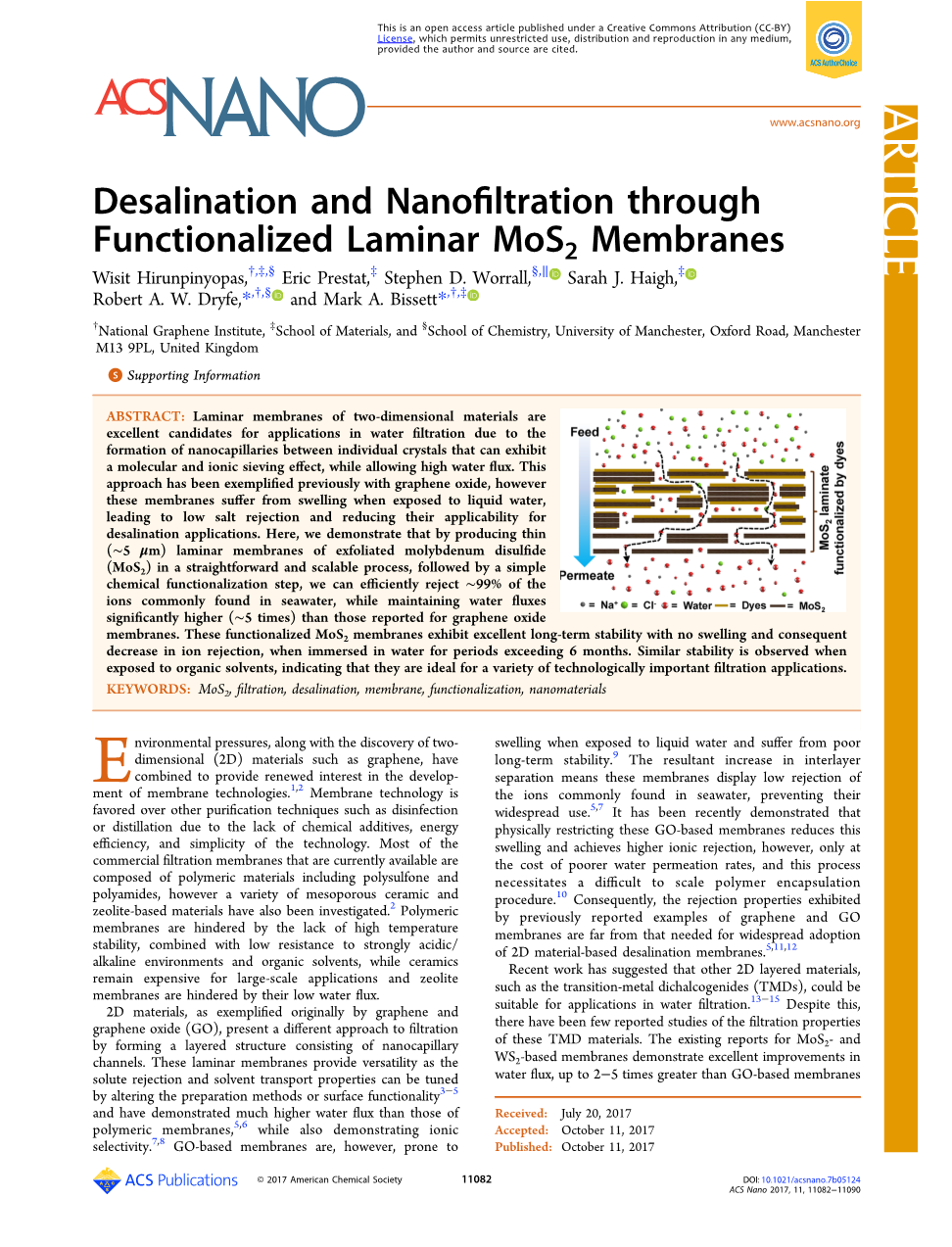 关键词:MoS2,过滤,脱盐,膜,官能团功能化,纳米材料