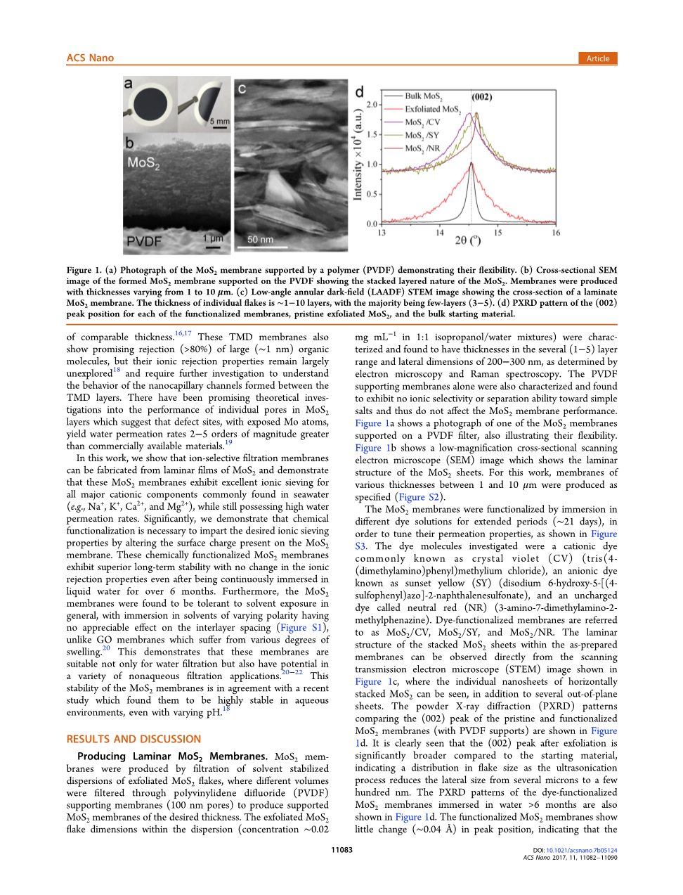 这这篇文章中,我们提出离子选择性渗透膜可由层状的MoS2膜制成,并说明了这些MoS2膜对普遍存在于海水中的主要阳离子组分(如Na 、K 、Ca2 和Mg2 )有很好的离子筛分作用,并且能保持高的透水率。并证明通过改变MoS2膜的表面电荷进行化学改性,对于优化需要的离子筛性能是有必要的。这些化学功能化改性的MoS2膜表现出极佳的长时间稳定性,即便被仅排在水中超过六个月也无离子截留性能的改变。此外,MoS2膜对大多数溶剂都有较高的耐性,浸入不同极性的溶剂中对层间距没有明显的影响,不像氧化石墨烯膜会发生不同程度的膨胀。这表明这些膜不光适用于水渗透中,也在许多非水体系的过滤中有较大的潜在性用。这种膜的稳定性与最近的一篇文章中发现的在溶液中的高稳定性一直,甚至是在极端的pH环境中。