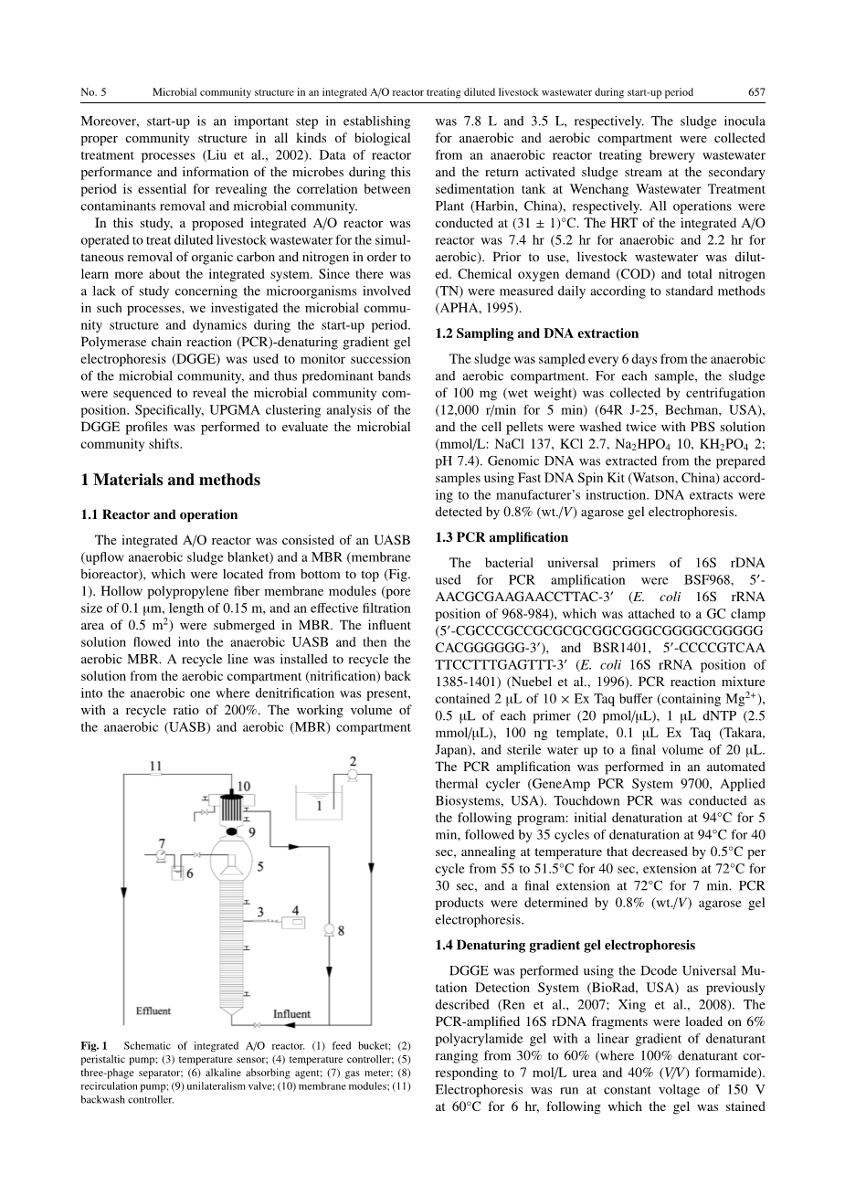 污泥每隔6天从厌氧和好氧室取样。对于每个样品,100毫克的污泥(湿重)收集离心(12000 r/min,5 min)(64r J-25,Bechman,美国),和细胞颗粒与PBS液洗两次(mmol/L:氯化钠137,氯化钾 2.7,磷酸氢二钠10;pH值7.4)。从制备的样品使用快速DNA试剂盒提取基因组DNA(Watson,中国)。用0.8%(重量/体积)琼脂糖凝胶电泳检测DNA提取液。