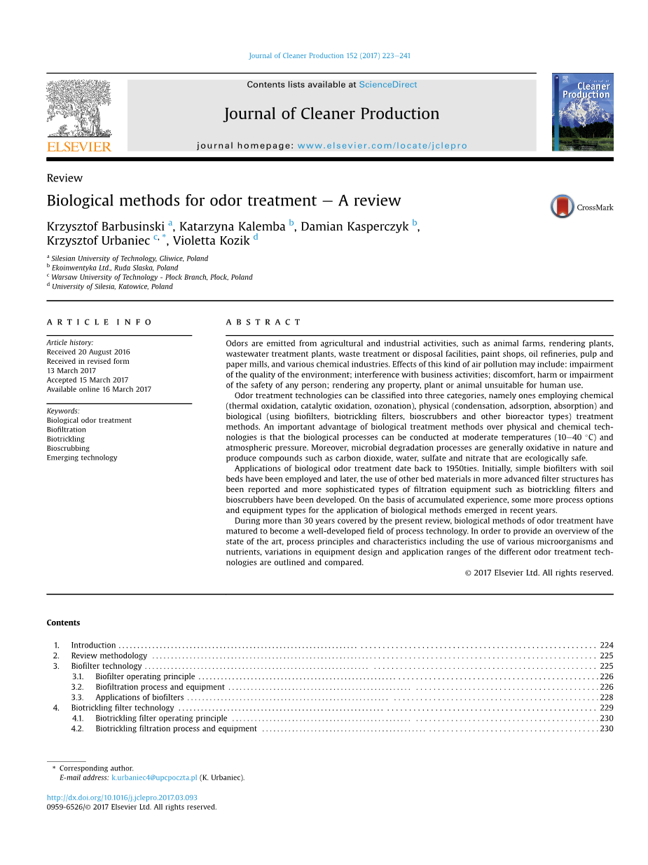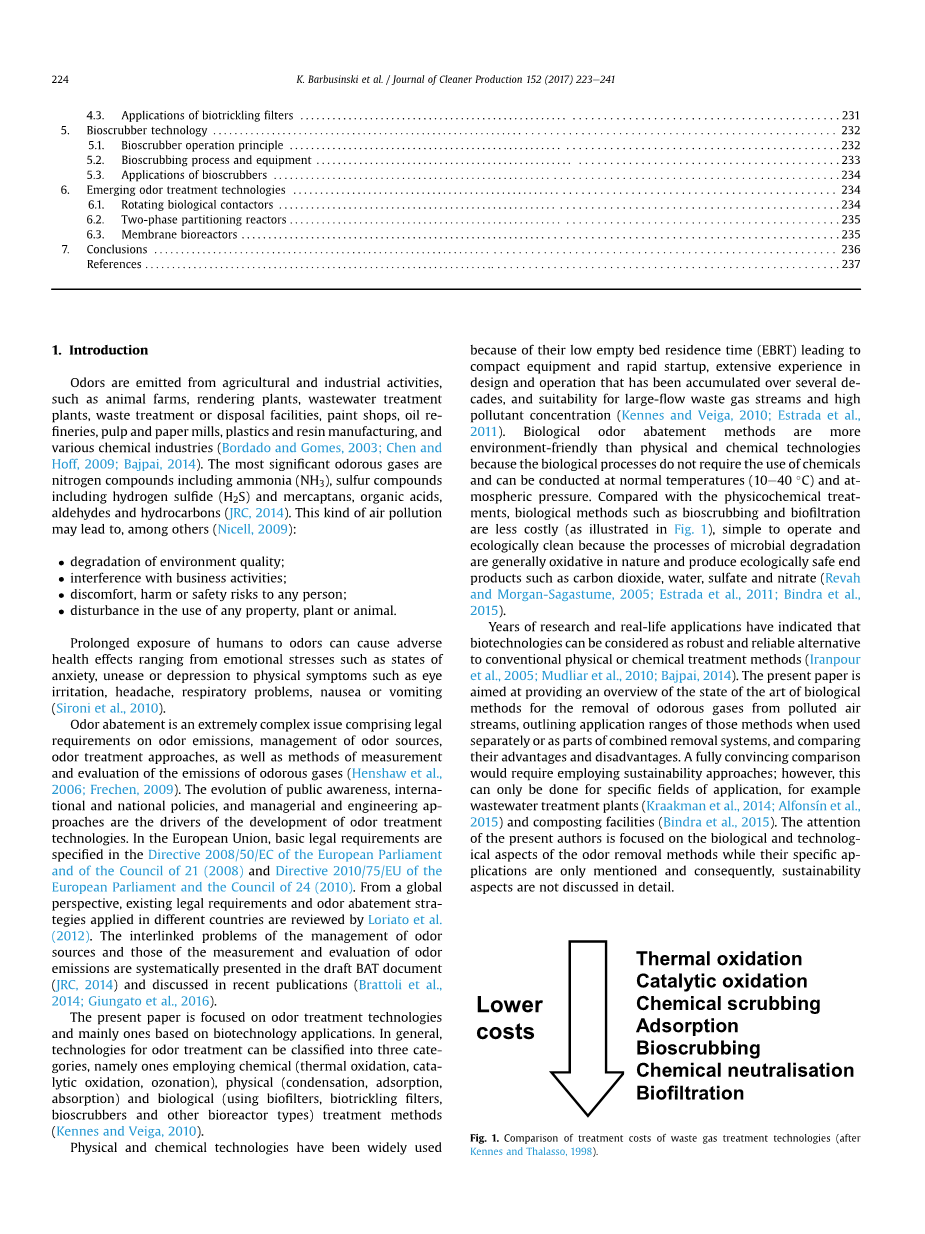 在本文中引用的大部分文献都是在为波兰工业实施气味处理生物学方法的多年研究和开发工作中收集的。在确定重要的研究方向时,其他作者以前发表的一些论文中的信息证明是有帮助的(Iranpour等,2005; Mudliar等,2010)。最近的关于废水和废气处理最佳可行技术的文件草案及化工部门和相关行业的管理体系(JRC,2014)也被考虑在内。