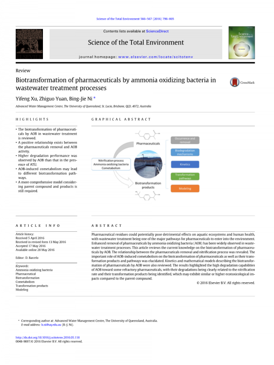 摘要:药物残留可能对水生生态系统和人类健康造成不利影响,废水处理是药物进入环境的主要途径之一。在废水处理过程中已广泛观察到通过氨氧化细菌增强的药物去除。本文回顾了氨氧化细菌对药物生物转化的现有知识。药物去除和硝化作用之间的关系过程被揭露。阐明了氨氧化细菌诱导的共代谢对药物生物转化及其转化产物和途径的重要作用。还回顾了描述氨氧化细菌对药物的生物转化的动力学和数学模型。结果强调了氨氧化细菌对某些耐火药物的高度降解能力,其降解明显与硝化速率及其鉴定的转化产物相关,与母体化合物相比,其可能表现出相似或更高的生态毒性影响。