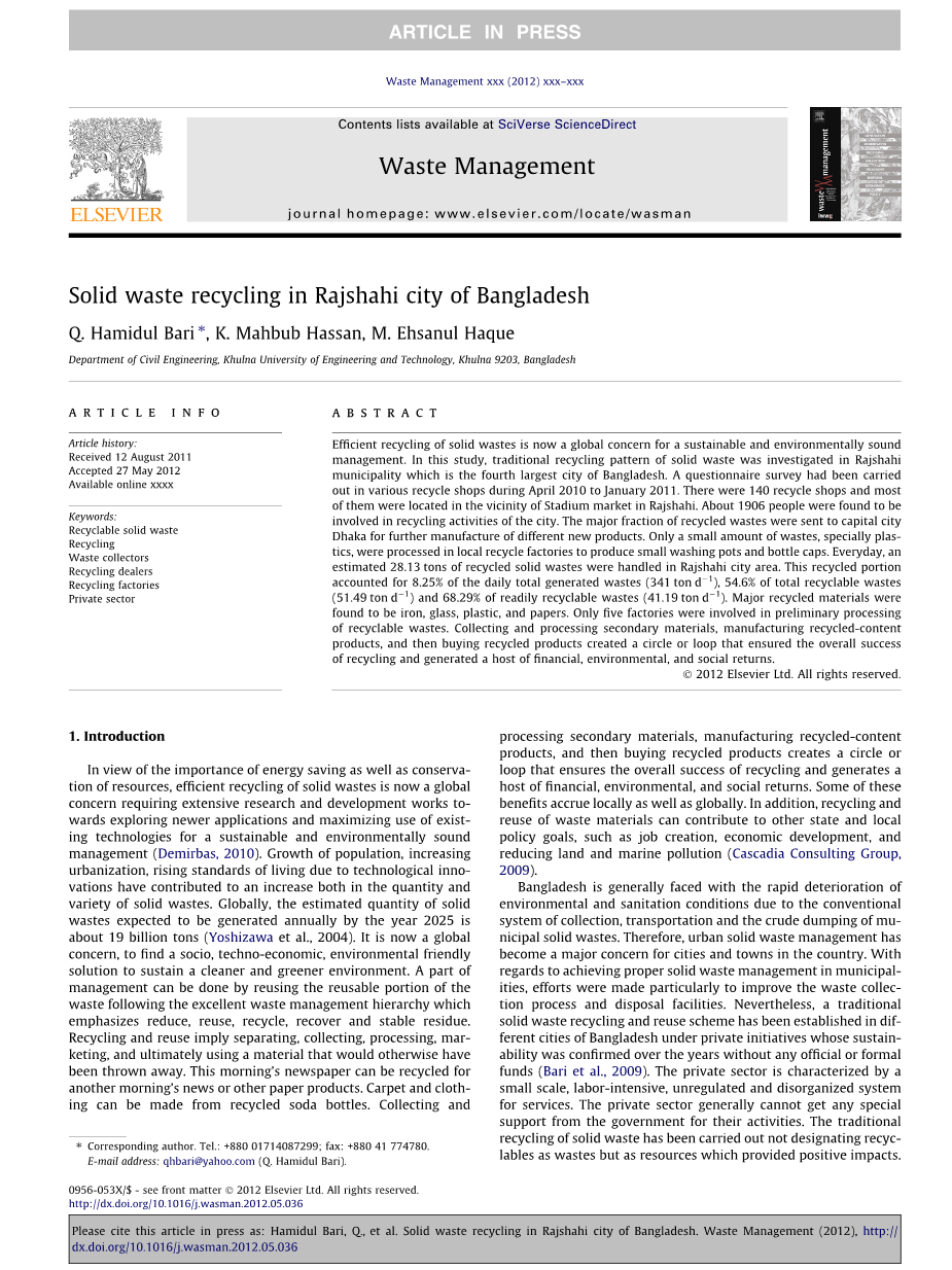 由于传统的集运系统、运输工具和粗劣固体废物的原油倾倒,孟加拉国普遍面临着环境和卫生条件的迅速恶化。因此,城市固体废弃物管理已成为我国城市和乡镇的主要问题。在市政建设中,要实现合理的固体废物管理,尤其要改善废物处理过程和处置设施。尽管如此,在孟加拉国的迪夫-费伦城市,一个传统的固体废物回收利用方案已经在私人项目中建立起来,这些项目的可持续性在没有任何官方或正式资金的情况下得到确认(Bari et al., 2009)。私营部门的特点是规模小,劳动密集,不受监管,组织混乱,私营部门通常无法得到政府的任何特别支持。传统的固体废物回收利用不被认为是垃圾回收利用,而是作为提供积极影响的资源。