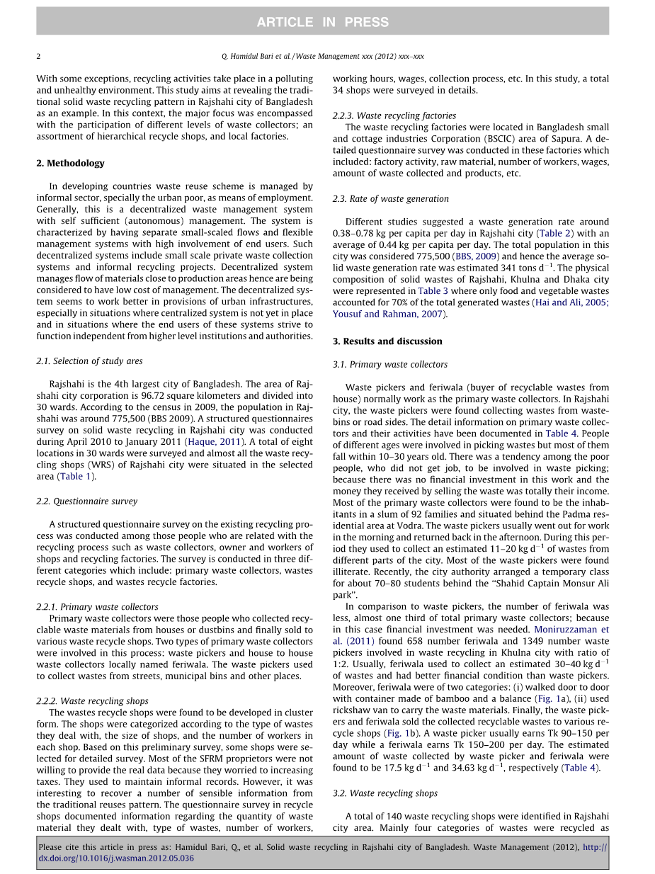 拾荒者和feriwala(在房间里回收废料的购买者)通常是主要的垃圾收集者。在 Rajshahi市,拾荒者被发现从垃圾箱或路边捡垃圾。表4中记录了主要垃圾收集者及其活动的详细信息。不同年龄段的人都参与了挑选废物的工作,但大多数人的年龄都在10到30岁之间。在那些没有得到工作的穷人中,有一种倾向,就是要参与到废物的采摘中去,因为在这项工作中没有金融投资,他们通过出售废品得到的钱完全是他们的收入。大多数主要的垃圾收集者被发现是在一个92户家庭的贫民窟里的,并且位于沃德拉的帕德马雷-伊德地区后面。拾荒者通常在早上出去工作,下午就回来了。在此期间,他们收集了来自城市不同地区的大约11到20公斤的废物。大部分的拾荒者都是文盲,最近,市当局安排了一个临时班级位于“沙希德阿里公园”的后面,大约有70到80名学生。
