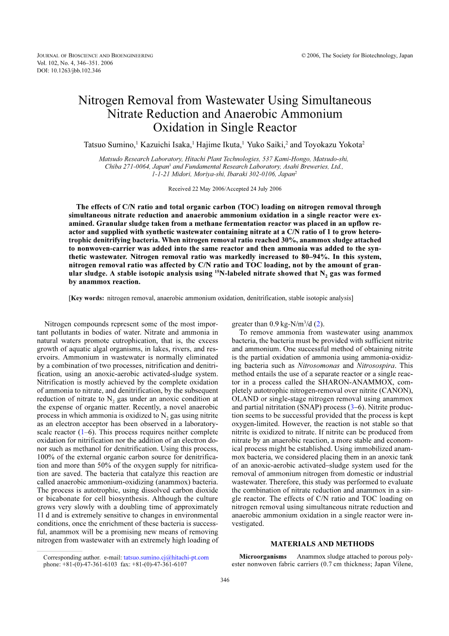 研究了C / N和总有机碳( TOC )负荷对单反应器同时硝化还原和厌氧氨氧化脱氮的影响。将来自甲烷发酵反应器的颗粒污泥置于上流反应器中,并以C / N比为1的比例供给含硝酸盐的合成废水以生长异养型反硝化细菌。当脱氮率达到30 %时,厌氧氨氧化污泥附着在非织造载体上被加入相同的反应器,然后向合成物中加入含氨废水。脱氮率显著提高到80~94 %。在这个系统中,氮去除率受C / N和TOC负荷的影响,而不受颗粒状污泥数量的影响。用15N标记的硝酸盐进行的稳定同位素分析表明, 厌氧氨氧化反应产生了N2。