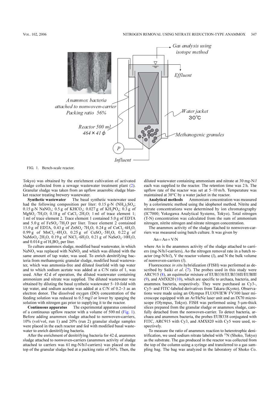 微生物 附着在多孔聚酯无纺布载体(厚度0.7cm;日本维林,东京)上的厌氧氨氧化污泥,是通过富集培养从污水处理厂收集的活性污泥得到的(2)。颗粒状污泥是从处理啤酒废水的上流厌氧污泥床反应器中取出的。