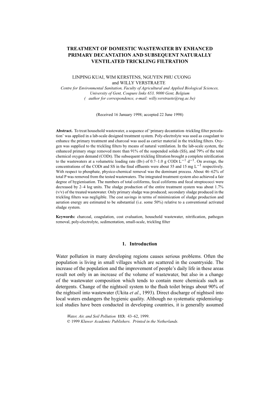 为处理生活污水,在实验室规模设计的处理系统中,采用了“一级分离-滴滤-渗滤”的方法。以聚电解质为混凝剂进行强化一级处理,以木炭为载体进行滴滤。氧是通过自然通风方式提供给滴流过滤器的.。在实验室规模系统中,强化初级阶段去除了超过91%的悬浮固体(SS)和79%的化学需氧量(CODt)。随后的滴灌过滤以0.7~1.0克CODtL-1d-1的容积负荷率(BV)对废水进行了完全硝化。最终出水CODt和SS的平均浓度分别为55和15 mg/ L。磷酸盐的去除主要是通过物理化学的方法。从试验废水中去除了约46~62%的总磷。综合处理系统也实现了相当程度的卫生。总大肠菌群、粪大肠菌群和粪链球菌数量减少2~4个对数单位。整个处理系统的污泥产量约为处理废水的1.7%(v/v)。只产生一次污泥,滴流滤池产生的二次污泥几乎可以忽略不计。相对于传统的活性污泥系统,在污泥产量和曝气能量最小化方面的成本节约估计是相当大的(即大约50%)。