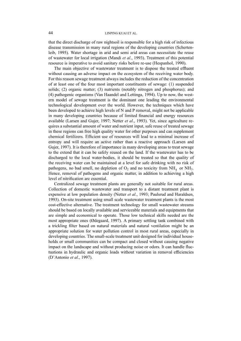 集中污水处理厂一般不适合农村地区。在人口密度低的情况下,收集家庭废水和运输到远距离处理厂的费用很高(Netter等人,1993年;Paulsrud和Haraldsen,1993年)。因此采用小型污水处理厂进行现场处理是成本效益最好的方案.。小型废水处理技术应以当地现有的、可使用的、操作简单、经济的材料和设备为基础。所需的低技术技能是最适当的技能(法国国家统计局,1997年)。在大多数农村地区,特别是在发展中国家,一种主要的沉淀池与以天然材料和自然通风为基础的滴流过滤器相结合,可能是控制水污染的适当解决办法。小规模的处理单元可以设计为个别紧凑和封闭的住房或小社区,不会对景观造成负面影响,也不会产生噪音或气味。它可以处理水力和有机负荷中的流体---而不改变去除效率(Dlsquo;Antonio等人,1997年)。