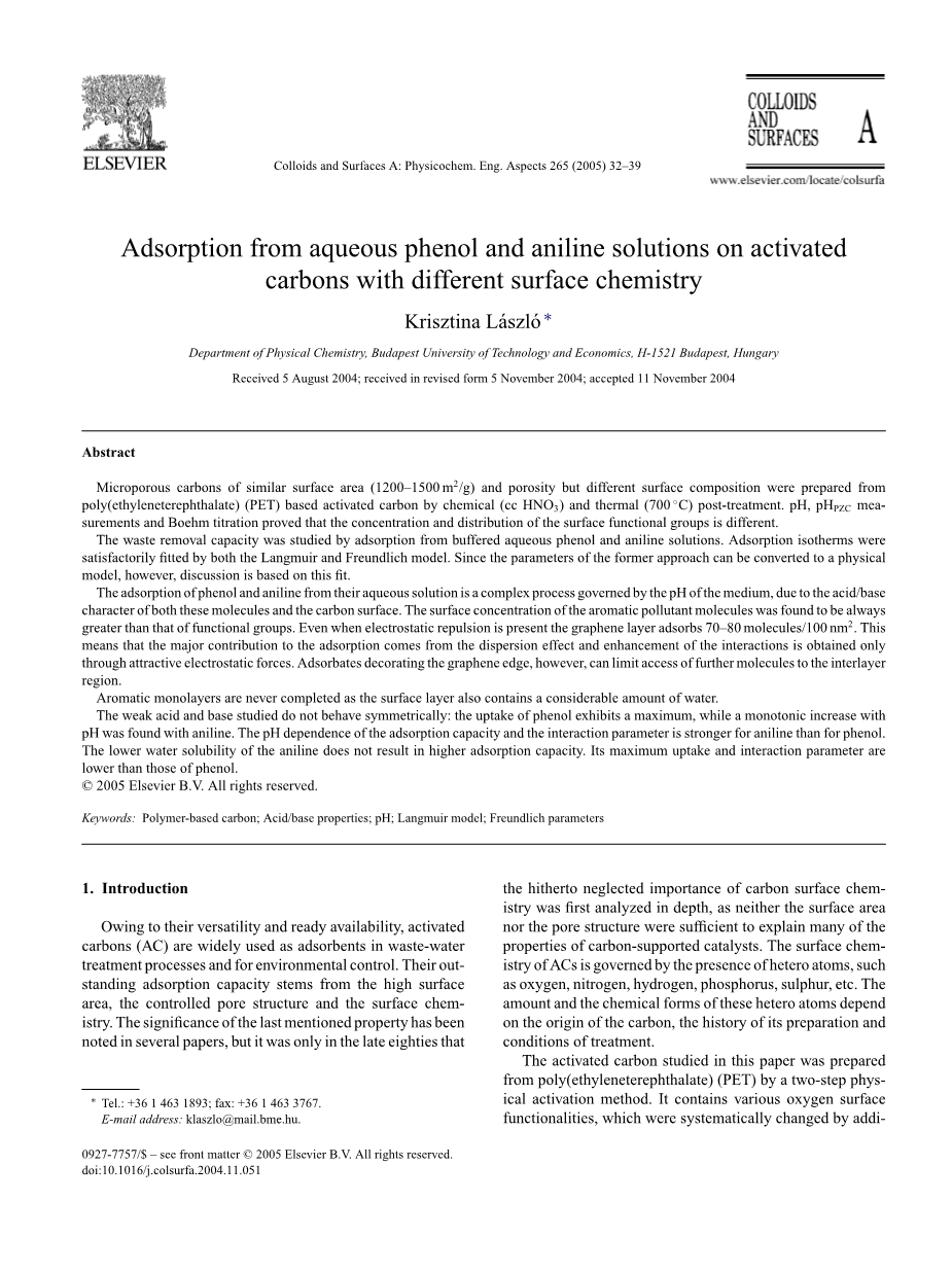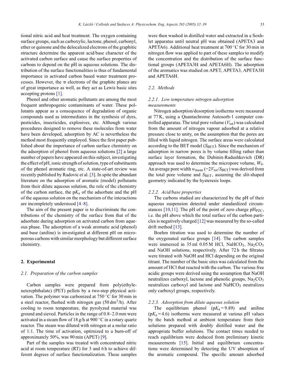不同表面化学性质的活性炭对苯酚和苯胺水溶液的吸附外文翻译资料