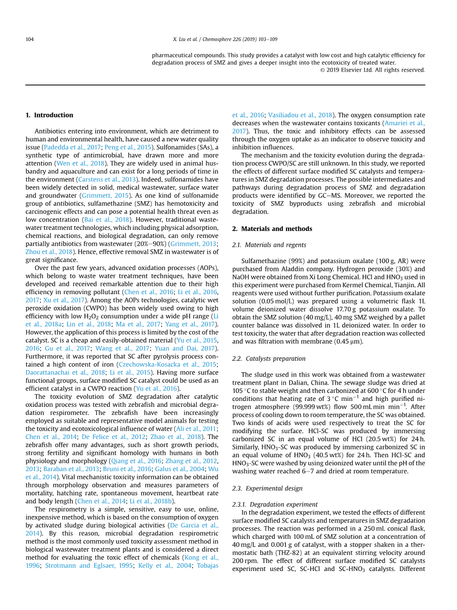 CWPO/SC降解过程中的机理和毒性演变尚不清楚。在本研究中,我们报道了不同表面改性SC催化剂和温度对SMZ降解过程的影响。通过GC-MS鉴定了SMZ和降解产物过程中可能的中间产物和途径。此外,我们还报道了用斑马鱼和微生物降解SMZ副产物的毒性。