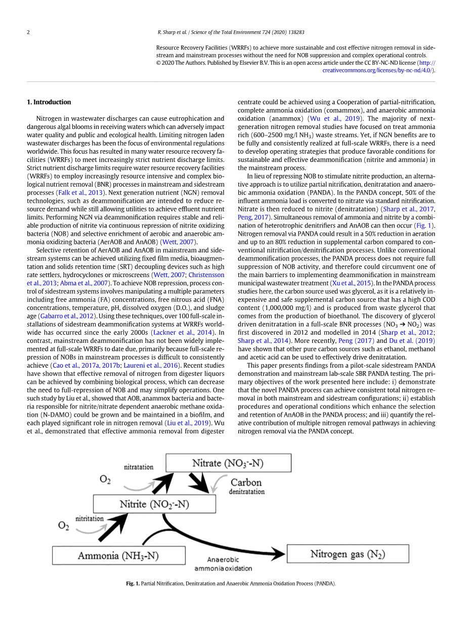 为了代替抑制NOB来刺激亚硝酸盐的生产,另一种方法是利用部分硝化、反硝化和厌氧氨氧化(PANDA)。在PANDA概念中,50%的进水氨负荷通过标准硝化作用转化为硝酸盐。硝酸盐被还原为亚硝酸盐(反硝化作用)。同时去除氨和亚硝酸盐的异养反硝化细菌和AnAOB的组合,然后可以发生。与传统的硝化/反硝化工艺相比,通过PANDA脱氮可以使曝气减少50%,补充碳减少80%。与传统除氨过程,PANDA过程不需要完全抑制NOB活性,因此可以绕过在主流城市污水处理中实施除氨的主要障碍之一。在PANDA过程研究中,使用的碳源是甘油,因为它是一种相对便宜和安全的补充碳源,COD含量高(1,000,000 mg/l),由生物乙醇生产过程中产生的废弃甘油产生。甘油驱动脱硝在一个全面的BNR过程(NO3 NO2)中被发现,在2012年首次发现,并在2014年建模。最近的研究表明,乙醇、甲醇和乙酸等纯碳源可以有效地促进脱硝。