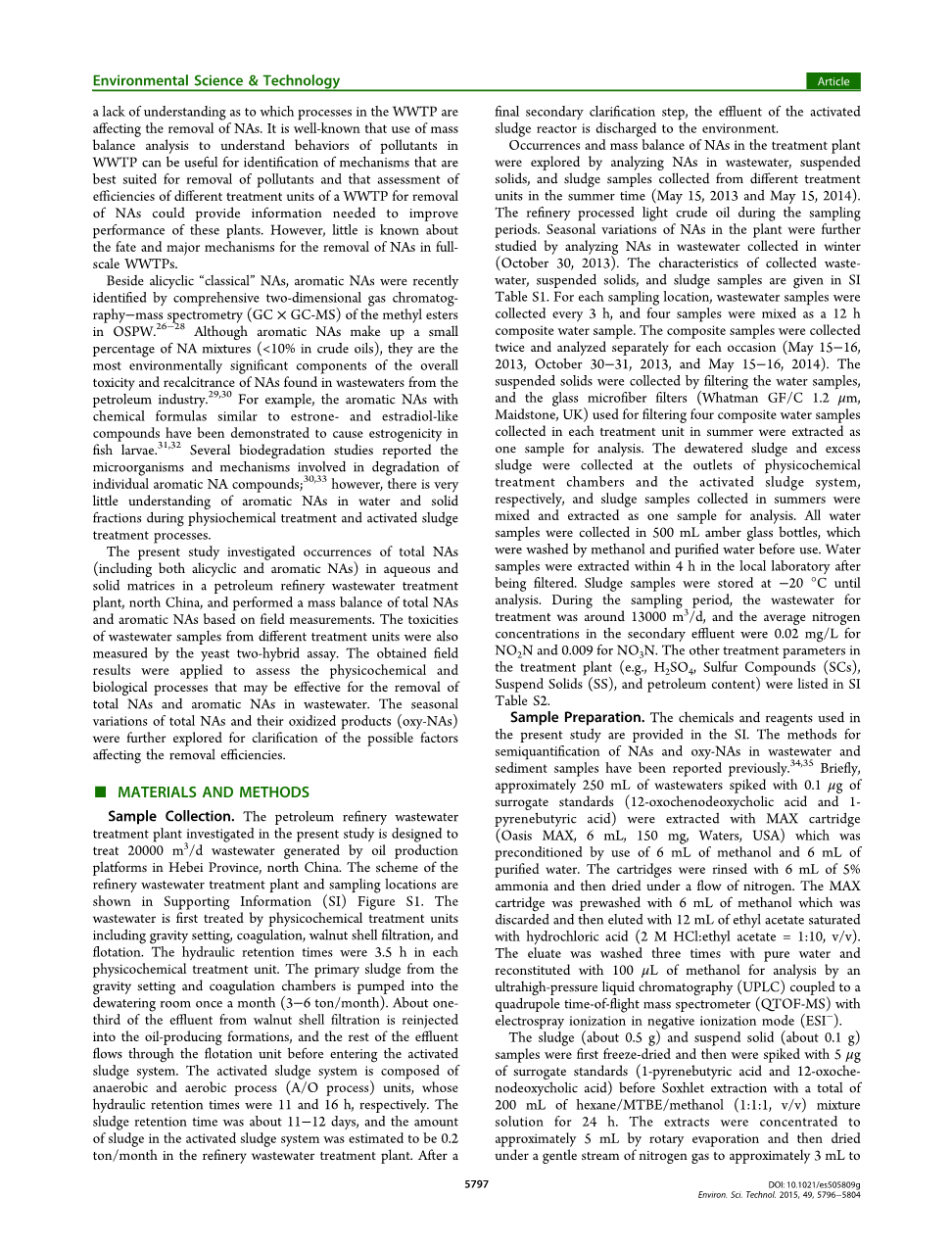 通过分析夏季(2013年5月15日和2014年5月15日)从不同处理单元收集的废水、悬浮物和污泥样本中的NAs,探讨了处理厂中在取样期间再加工的轻质原油中NAs的存在和质量平衡。通过对该厂冬季(2013年10月30日)废水中NAs的分析,进一步研究了该厂NAs的季节性变化。收集的废水、悬浮物和污泥样品的特性见SI表S1。在每个采样点,每3小时采集一次废水样本,并将4个样本混合为12小时的复合水样。对复合样品进行两次采集,并分别对每种情况(2013年5月15日至16日、2013年10月30日至31日和2014年5月15日至16日)进行分析。通过过滤水样收集悬浮固体,并提取用于过滤夏天在每个处理单元收集的四个复合水样的玻璃微过滤器(英国梅德斯通Whatman GF/C 1.2mu;m)作为一个样本进行分析。脱水污泥和剩余污泥分别在理化处理室和活性污泥系统出口处收集,夏季收集的污泥作为一个样品进行混合提取分析。所有水样收集在500毫升琥珀色玻璃瓶中,使用前用甲醇和纯净水清洗。水样在过滤后4小时内在当地实验室提取。污泥样品在-20°C下储存,直到分析。采样期间,处理废水约13000 m3/d,二次松露中NO2N和NO3N的平均氮浓度分别为0.02 mg/L和0.009 mg/L,处理厂其他处理参数(如H2SO4、硫化物(SCs)、悬浮物(SS)、石油类等)见SI表S2。