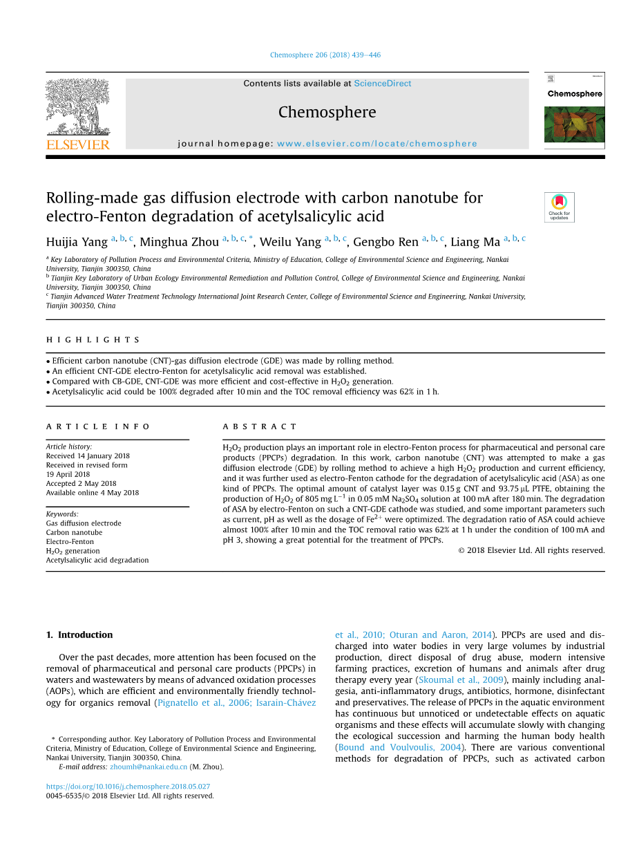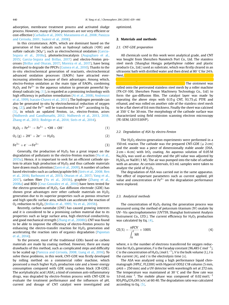 碳纳米管轧制气体扩散电极用于电芬顿技术降解阿司匹林