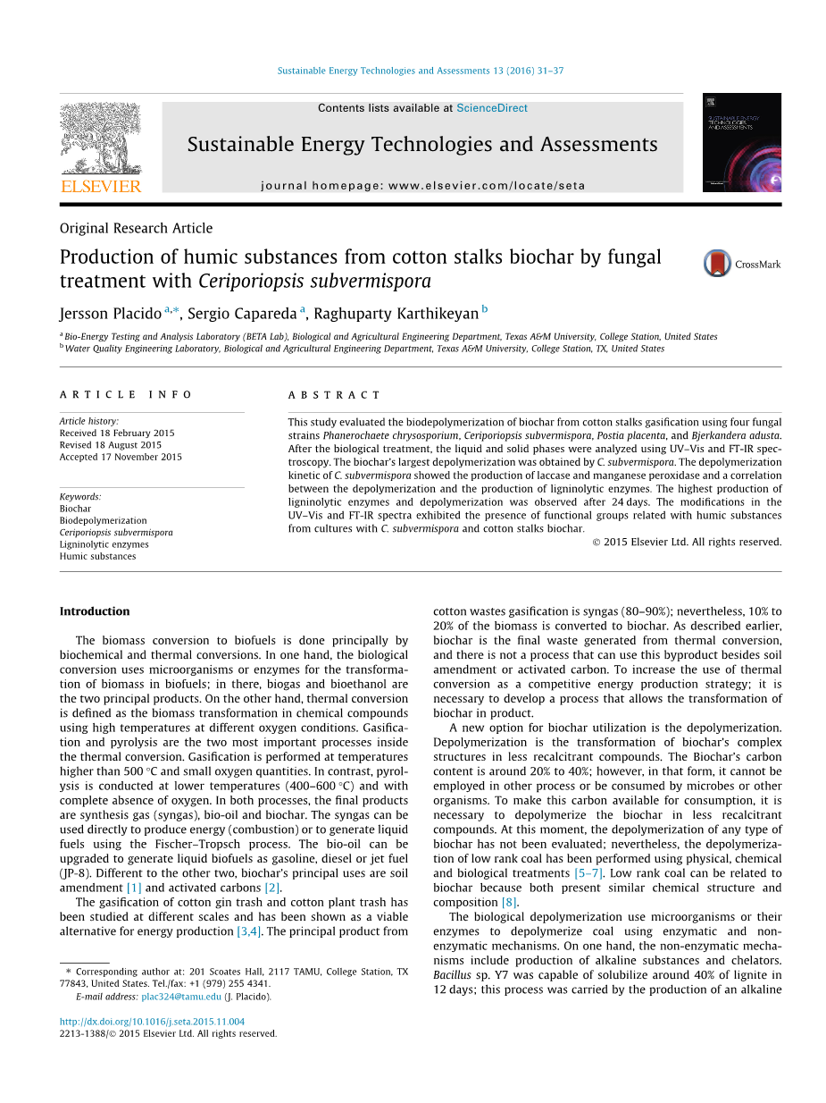 这项研究使用四种真菌菌株黄孢原毛平革菌,虫拟蜡菌,褐腐菌和Bjerkandera adusta评估了棉秆气化过程中生物炭的生物解聚。经过生物处理后,使用UV-Vis和FT-IR光谱对液相和固相进行了分析。从虫拟蜡菌中获得了最大的生物炭解聚反应。虫拟蜡菌的解聚动力学表明漆酶和锰过氧化物酶的产生以及解聚与木质素分解酶的产生之间的相关性。24天后观察到木质素分解酶和解聚的最高产量。UV-Vis和FT-IR光谱中的修正显示存在与来自虫拟蜡菌和棉秆生物炭的培养物中的腐殖物质相关的官能团。
