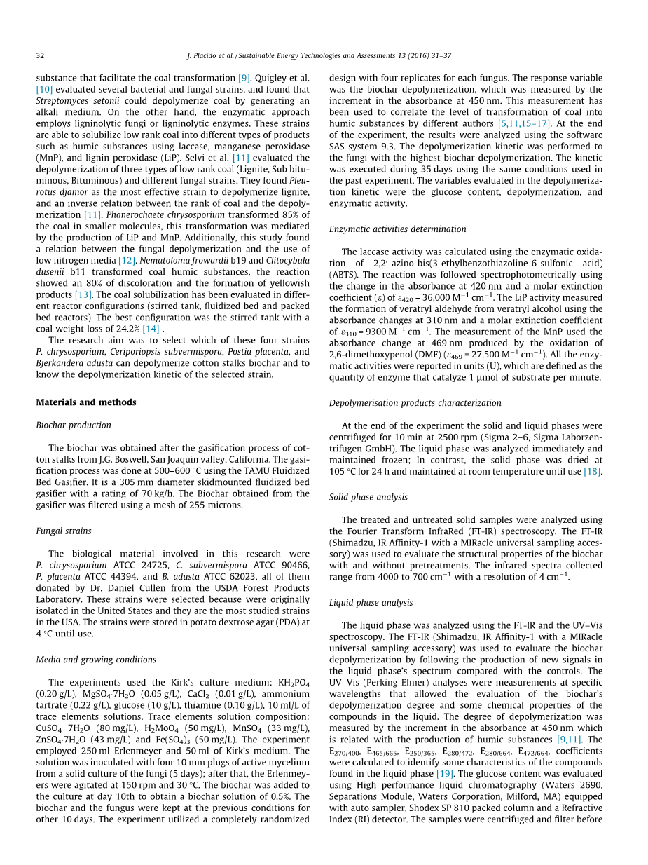 该研究的目的是选择这四个菌株中的黄孢原毛平革菌,虫拟蜡菌,褐腐菌和Bjerkandera adusta中的哪一个可以使棉秆生物炭解聚,并了解所选菌株的解聚动力学。