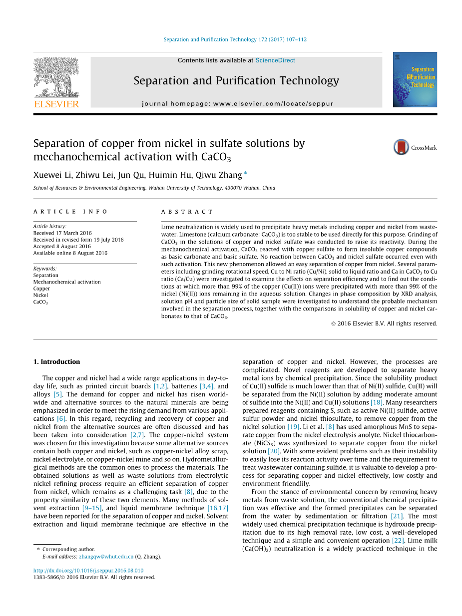 机械力化学活化CaCO3用于Cu-Ni硫酸盐溶液中铜的分离