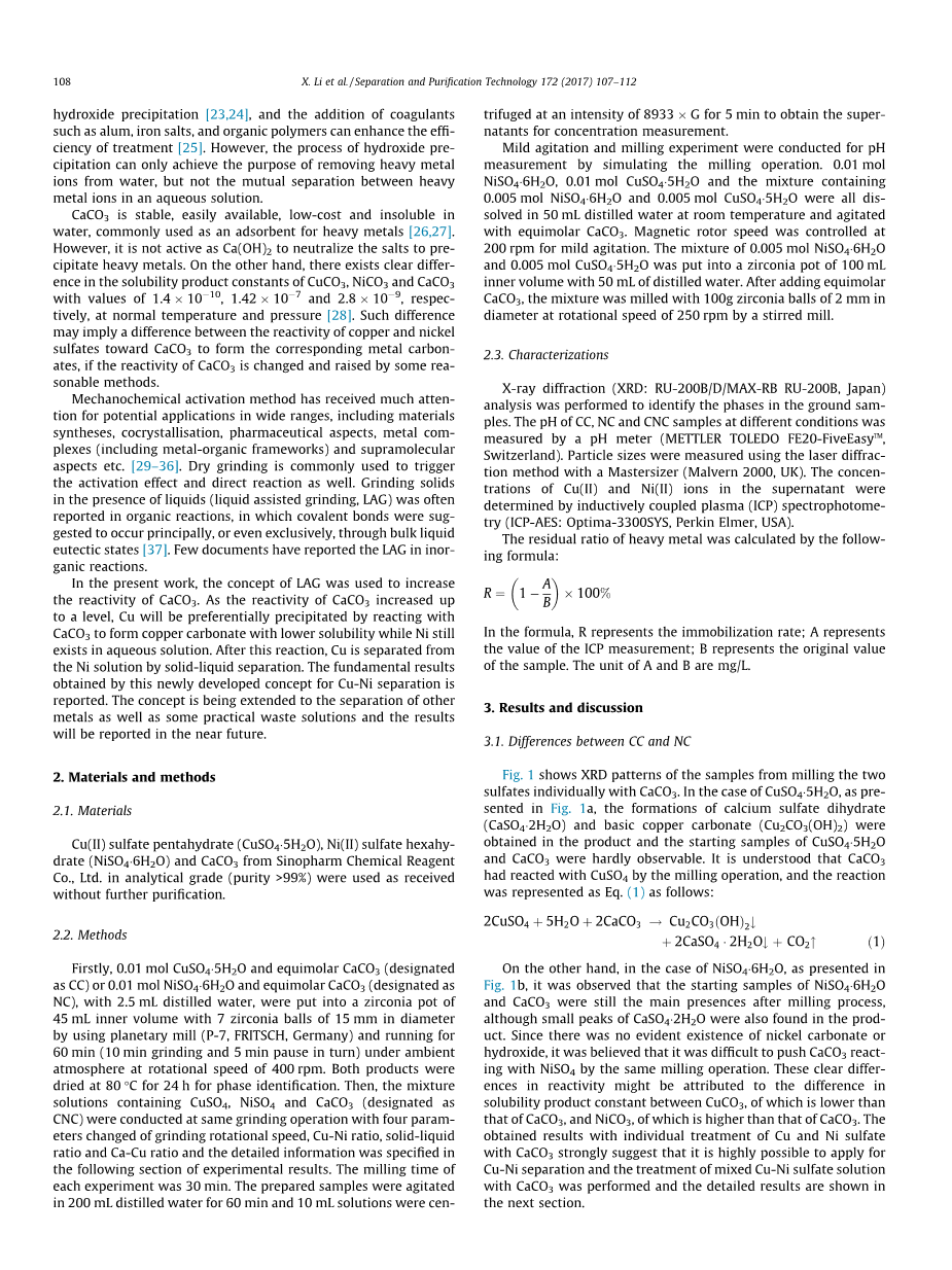 碳酸钙稳定、易得、成本低且不溶于水,常用作重金属的吸附剂。然而,它不能像氢氧化钙那样中和盐去沉淀重金属。另一方面,在常温和常压下,CuCO3、NiCO3和CaCO3的溶度积常数分别为1.4times;10-10、1.42times;10-7和2.8times;10-9。如果通过合理的方法改变和提高碳酸钙的反应活性,则硫酸铜和硫酸镍对碳酸钙形成相应金属碳酸盐的反应活性可能存在差异。机械化学活化法在材料合成、共晶化、制药、金属配合物(包括金属-有机骨架)和超分子等方面有着广泛的应用前景。干磨是激发活化效应和直接反应的常用方法。在有机反应中,经常报道在液体介质中研磨固体(液体辅助研磨,LAG),其中共价键主要或甚至仅通过液体共晶态发生很少有文献报道过无机反应中的LAG。