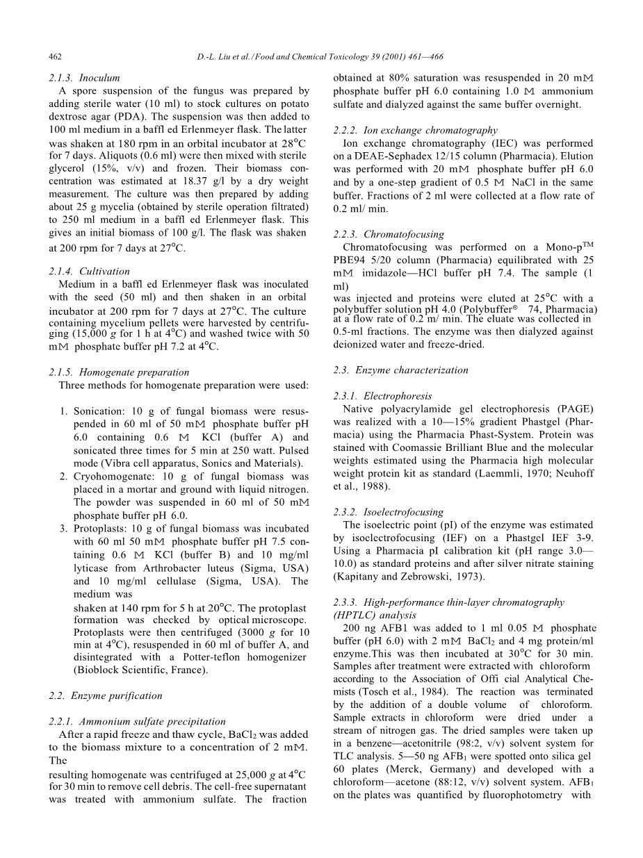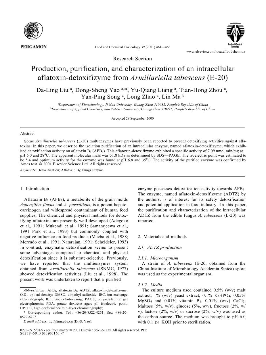 黄曲霉毒素B1(AFB1)是谷物霉菌黄曲霉和寄生曲霉的代谢产物,是一种强力的肝致癌物,是人类食品中广泛的污染物。黄曲霉毒素解毒的化学和物理方法目前很发达(Adegoke等,1991;Mukendi等,1991;Samarajeewa等,1991Park等,1993),但通常会对食品产生负面影响(Maeba等人,1988;Mercado等人,1991;Nataranjan,1991;Scheideler,1993)相反,酶解毒与化学和物理解毒相比似乎具有一些优势,因为它对底物具有选择性。以前,我们曾报道过从假蜜环菌(Armillariella tabescens)获得的多酶系统(JSNMC,1977)表现出排毒活性(Liuetal.,1998)。目前的工作是为了报告该酶对AFB1具有排毒活性。该酶被作者称为黄曲霉毒素解毒酶(ADTZ),因其安全解毒和在食品工业中的潜在应用而备受关注。本文报道了食用菌A. tabescens(E-20)对胞内ADTZ的纯化和表征。