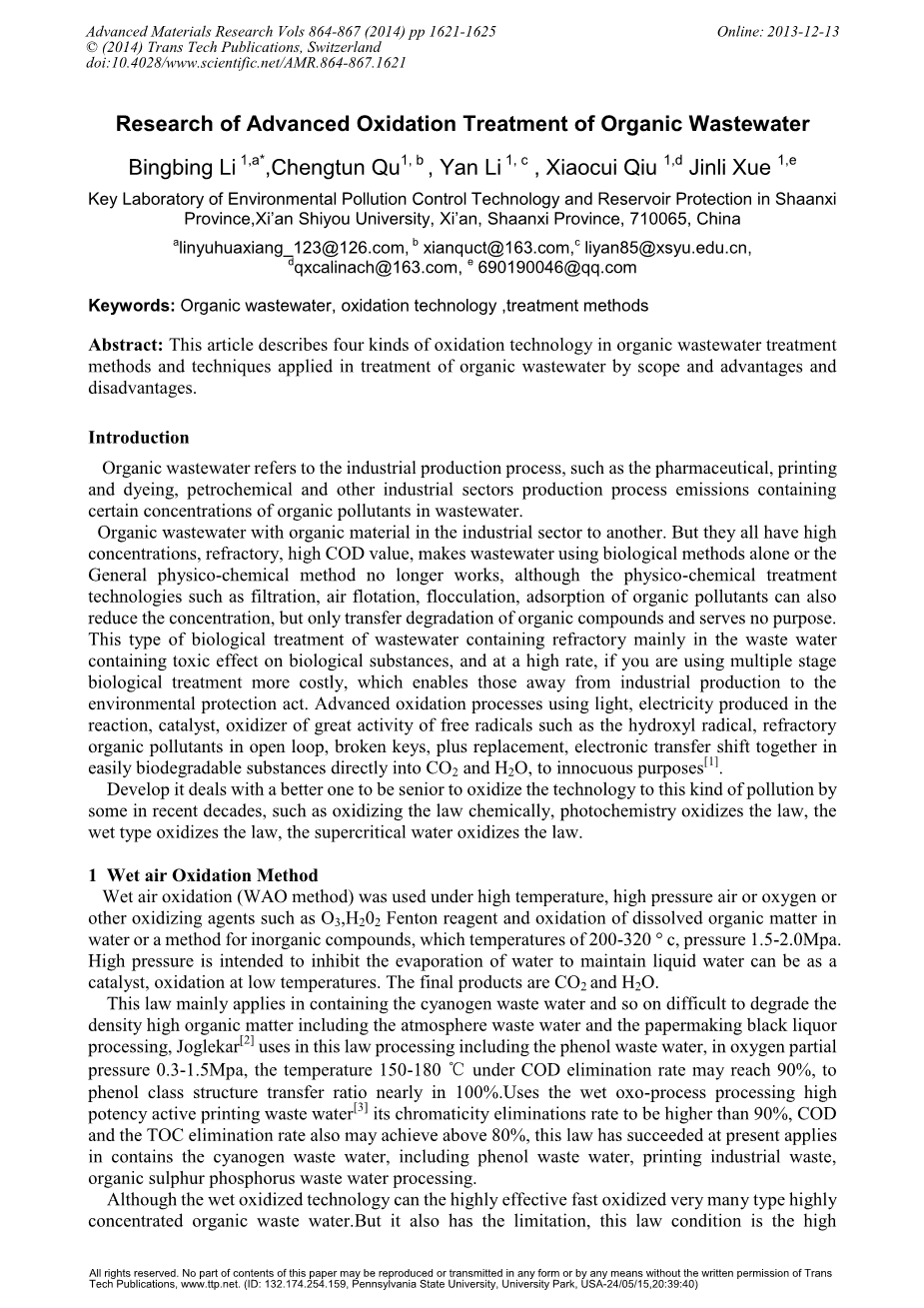 近几十年来一直在发展和研制更好更先进的氧化技术来处理这类型的污染物,比如化学氧化法、光化学氧化法、湿式氧化法和超临界水氧化法。