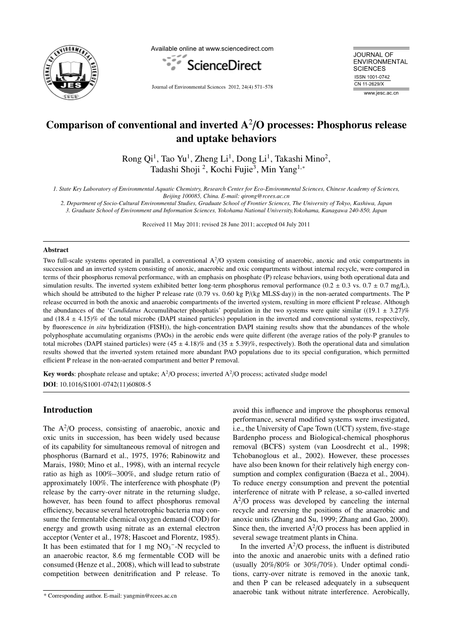 在这次研究中,将位于中国北方的污水处理厂中的平行全尺寸常规A2/O工艺和倒置A2/O工艺的磷释放和吸收行为进行比较。 用荧光原位杂交(FISH)技术定量PAO,4,6-二脒基-2-苯基吲哚(DAPI)高浓度染色方法用于在活性污泥中定量细胞间聚磷酸盐(poly-P)颗粒(Wong等,2005)。 同时,使用活性污泥模型(ASM)来模拟这两个工艺,特别是关注磷的释放和吸收行为。 这将是对全尺寸倒置A2/O工艺除磷性能的首次综合研究。