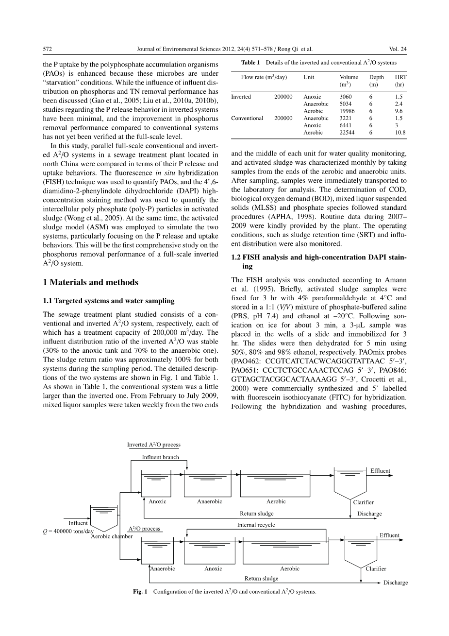 所研究的污水处理厂分别由常规和倒置A2/O工艺组成,每个系统的处理能力为200,000立方米/天。倒置A2/O的进水分配比是稳定的(缺氧池为30%,厌氧池为70%)。在采样期间,两个系统的污泥回流率均约为100%。两种系统的详细说明如图1和表1所示。如表1所示,常规系统比反向系统大一些。从2009年2月至2009年7月,每周从每个单元的两端和中部采集混合液样品以进行水质监测,并通过从需氧和厌氧单元的端部采集样品,对活性污泥进行每月表征。采样后,样品立即被运送到实验室进行分析。化学需氧量,生物需氧量(BOD),混合液悬浮固体(MLSS)和磷酸盐种类的测定遵循标准程序(APHA,1998)。该工厂提供了2007-2009年的常规数据。还监测了运行条件,例如污泥保留时间(SRT)和进水量。