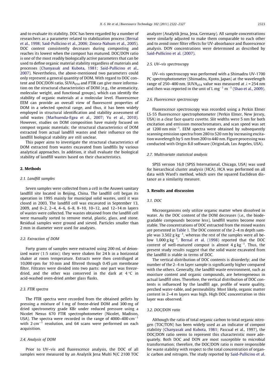 垃圾填埋场由一个非均匀混合物组成。。然而,用Montejo等人的报告(2010)显示,78.2%的城市生活垃圾堆肥由堆肥组成的有机物。因此,对有机物的研究有助于评价性的填埋场的稳定性。同时,有机材料的生物化学转化主要发生在水溶性期。发生在溶解有机物(DOM)变化的研究在评估其稳定性上是有用的(Said-Pullicino et al.,2007)。几个物理化学和光谱参数,如溶解有机碳(DOC),溶解有机碳比溶解有机氮(DOC/DON),具体的紫外线在254 nm处的吸光度(SUVA254),傅里叶变换红外(FTIR),三维荧光激发发射矩阵(EEM)谱,已被应用于表征DOM的组成和评价其稳定性。DOC已经被大量研究者视为稳定过程相关的参数(Bernal 等人.,1998;Said-Pullicino 等人.,2006;Zmora-nahum等人.,2005)。在堆肥过程中,DOC的内容始终减少,达到最低时,堆肥已经成熟。DOC/DON的比率是一个最容易的生物活性参数,可以用来定义有机材料稳定性的材料和工艺(Chanyasak and Kubota, 1981; Said-Pullicino 等人., 2007)。然而,上述两参数只能代表DOM总数量。关于DOC的内容与DOC/DON的比值,SUVA254和FTIR对DOM的结构特性的详细信息(例如,芳香性,分子量,和官能团),它可以在分子水平上鉴别有机材料的稳定性。荧光EEM可以提供在一个选定的光谱范围,DOM的荧光特性总体视图,因此,它已被广泛用于结构鉴定和固体废物稳定评估((Marhuenda-Egea 等人, 2007; Yu e等人, 2010)。然而,在DOM组成的研究主要集中在堆肥的有机材料;DOM的结构特点与实际填埋废物及其影响填埋场生物稳定性仍不清楚。