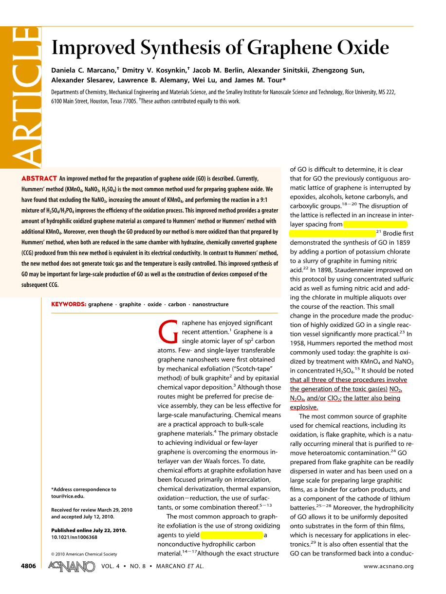摘要:一种制备氧化石墨烯的改良方法正在被运用。现在,Hummer法成为最常用的制备氧化石墨烯的方法(KMnO4,NaNo3,H2SO4)。我们发现除NaNo3外,增加KMnO4的用量并在比例为9:1的H2SO4与H3PO4混合液中反应,可提高氧化过程的效率。这种改良方法相较Hummer法或增加KMnO4用量的Hummer法,能产生更多的亲水的氧化石墨烯材料。而且,就算是用我们的方法生成的氧化石墨烯比Hummer法有更大的氧化程度,但减少相同数量的肼基团,新方法下产生的化学转化石墨烯与之拥有相等的导电性。与Hummer法相对比,新方法不产生有毒气体且温度易于控制。合成氧化石墨烯的改良方法对于大规模生产氧化石墨烯很有意义以及随后化学转化石墨烯的结构。