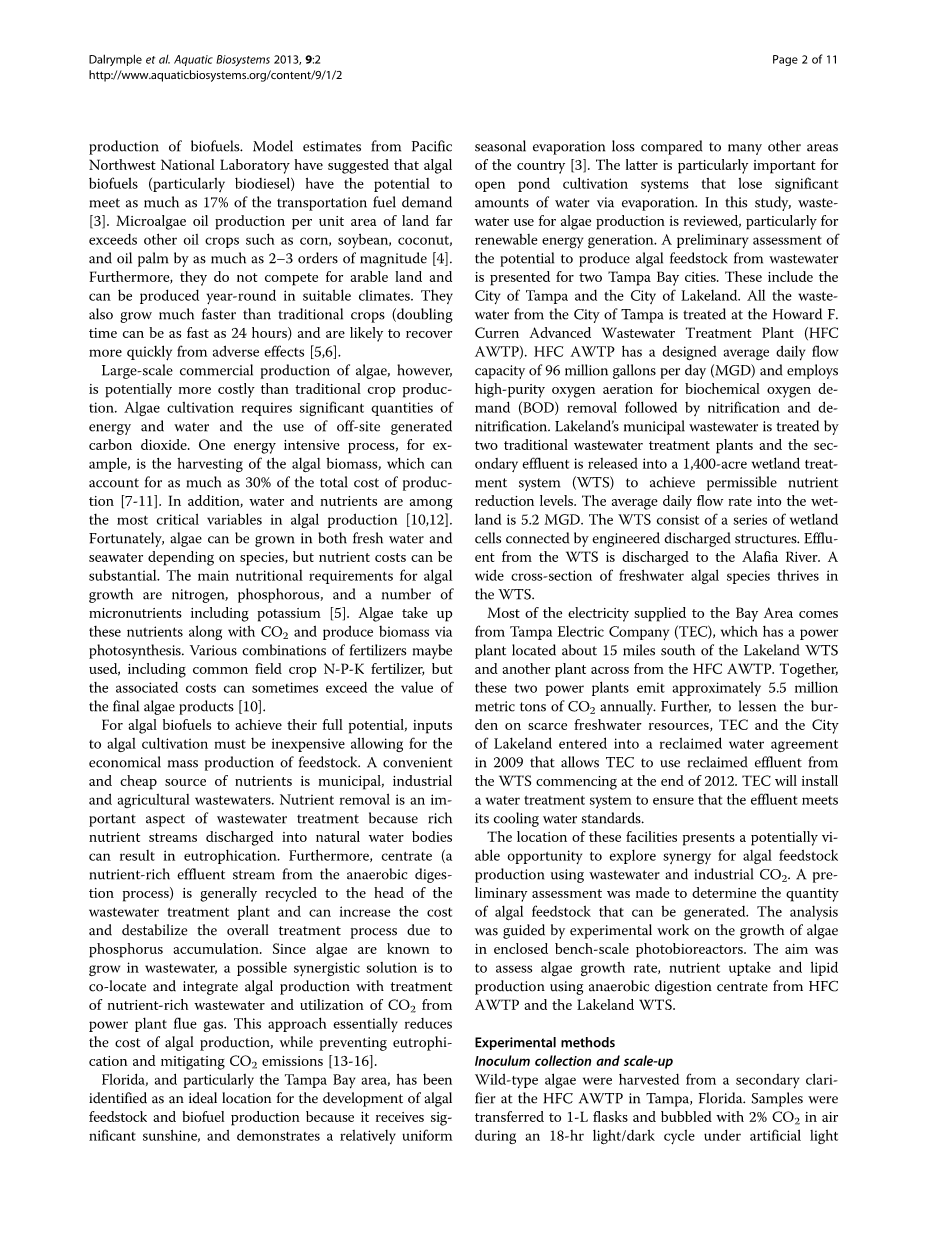 佛罗里达州,特别是坦帕湾地区,已被确定为藻类原料和生物燃料生产的理想位置,因为它接收大量的阳光,并且相比于这个国家的其他地区而言,其季节蒸发损失相对均衡。后者对开放池培养系统特别重要,其主要通过蒸发损失大量的水。在这项研究中,我们重新评估了废水在藻类生产方面的使用,特别是可再生能源发电方向。对废水中生产藻原料的潜力进行初步评估,提出了2个坦帕湾的城市,包括坦帕市和莱克兰城。所有坦帕市的废水都在HFCAWTP污水处理厂处理。HFCAWTP设计平均每日流量为9600万加仑/天,采用高纯度氧气曝气,通过硝化和反硝化作用去除生化需氧量(BOD)。莱克兰城的市政废水由两个传统的污水处理厂处理,二级出水排放到一个1400英亩的湿地处理系统(WTS)以达到允许的营养减少的水平。排放至湿地的平均每日流量为520万加仑/天。WTS是由一系列工程排放结构连接而成的湿地细胞组成。WTS的出水排放到Alafia River。WTS中生长着大量的淡水藻类。