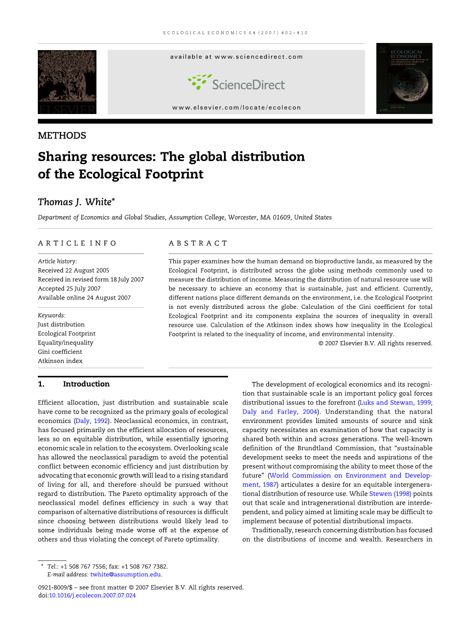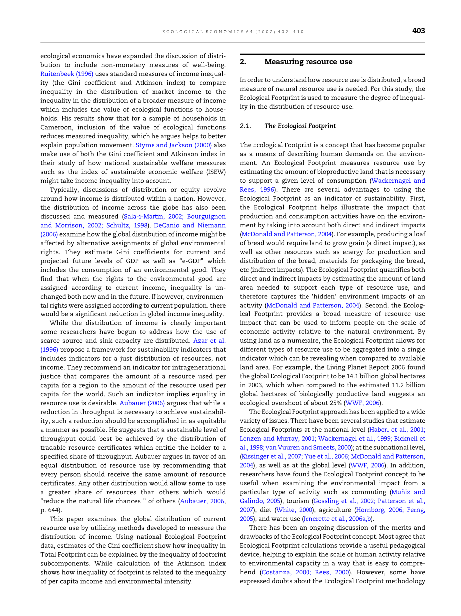 本文旨在利用目前发展成熟的方法测量收入分配从而研究目前全球的资源利用分配。使用国家生态足迹数据,估计基尼系数显示总的生态足迹的不平等性如何用各地生态足迹的不平等性加以解释。。而阿特金森指数的计算在于研究生态足迹的不平等性与不平等的人均收入和环境强度之间的关系。