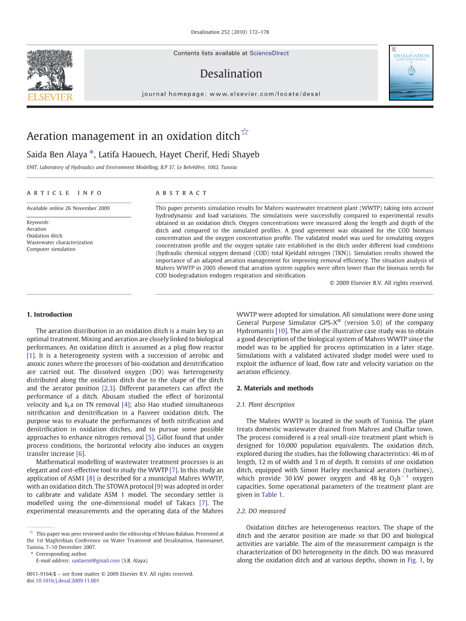 Mahres污水处理厂位于突尼斯南部。该工厂处理从马雷斯和沙法尔镇排出的生活污水。所考虑的过程是一个真正的小规模处理厂,设计用于10,000人口当量。研究期间探索的氧化沟具有以下特点:长46米,宽12米,深3米。它包括一个氧化沟,配备了西蒙哈雷机械曝气机(涡轮机),它提供30 kW功率氧气和48 kg O2h-1氧气容量。处理厂的一些操作参数在表1中给出。