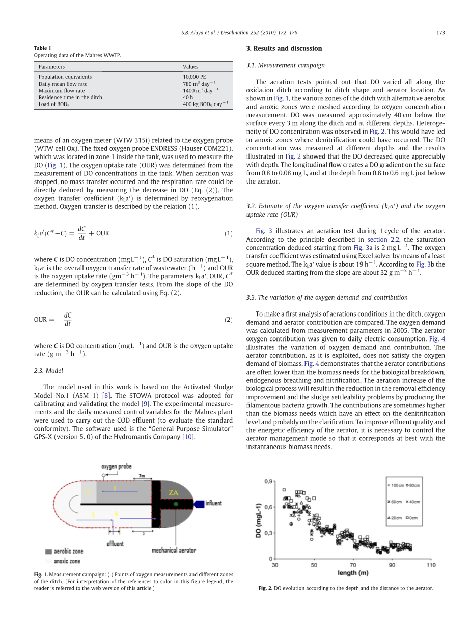 氧化沟是异相反应器。沟渠和曝气器位置的形状使得DO和生物活动是可变的。测量活动的目的是描述沟渠中DO异质性的特征。 DO沿着氧化沟和各种深度测量,如图1所示。 1,通过与氧探针(WTW电池Ox)相关的氧气计(WTW 315i)。位于罐内1区的固定氧探头ENDRESS(Hauser COM221)用于测量DO(图1)。氧气吸收速率(OUR)是通过罐中DO浓度的测定来确定的。当通气停止时,不发生传质,通过测量DO(Eq。(2))的减少可以直接推导出呼吸速率。氧气传递系数(kLa)通过再氧化法测定。 氧转移由关系式(1)描述。