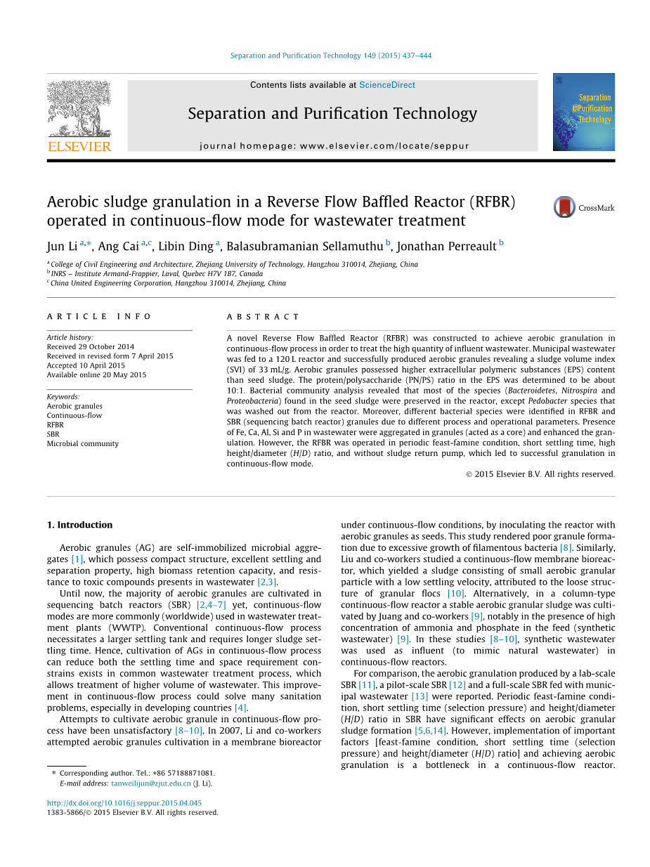 一种新型的反向流动反应器(RFBR),可以实现好氧造粒的连续流程,以处理大量的污水。市政废水等。进料到120升反应器中,成功生产出有利于污泥体积指数的好氧颗粒(SVI)为33mL / g。有氧颗粒具有更高的细胞外聚合物质(EPS)含量比种泥。 EPS中的蛋白质/多糖(PN / PS)比率确定为约10:1。细菌社区分析显示,大多数物种(细菌属,硝硝菌属和在种子污泥中发现的变形杆菌被保存在反应器中,除了Pedobacter种从反应器中洗出来。此外,在RFBR中鉴定出不同的细菌种类SBR(顺序间歇反应器)颗粒由于不同的工艺和操作参数。存在