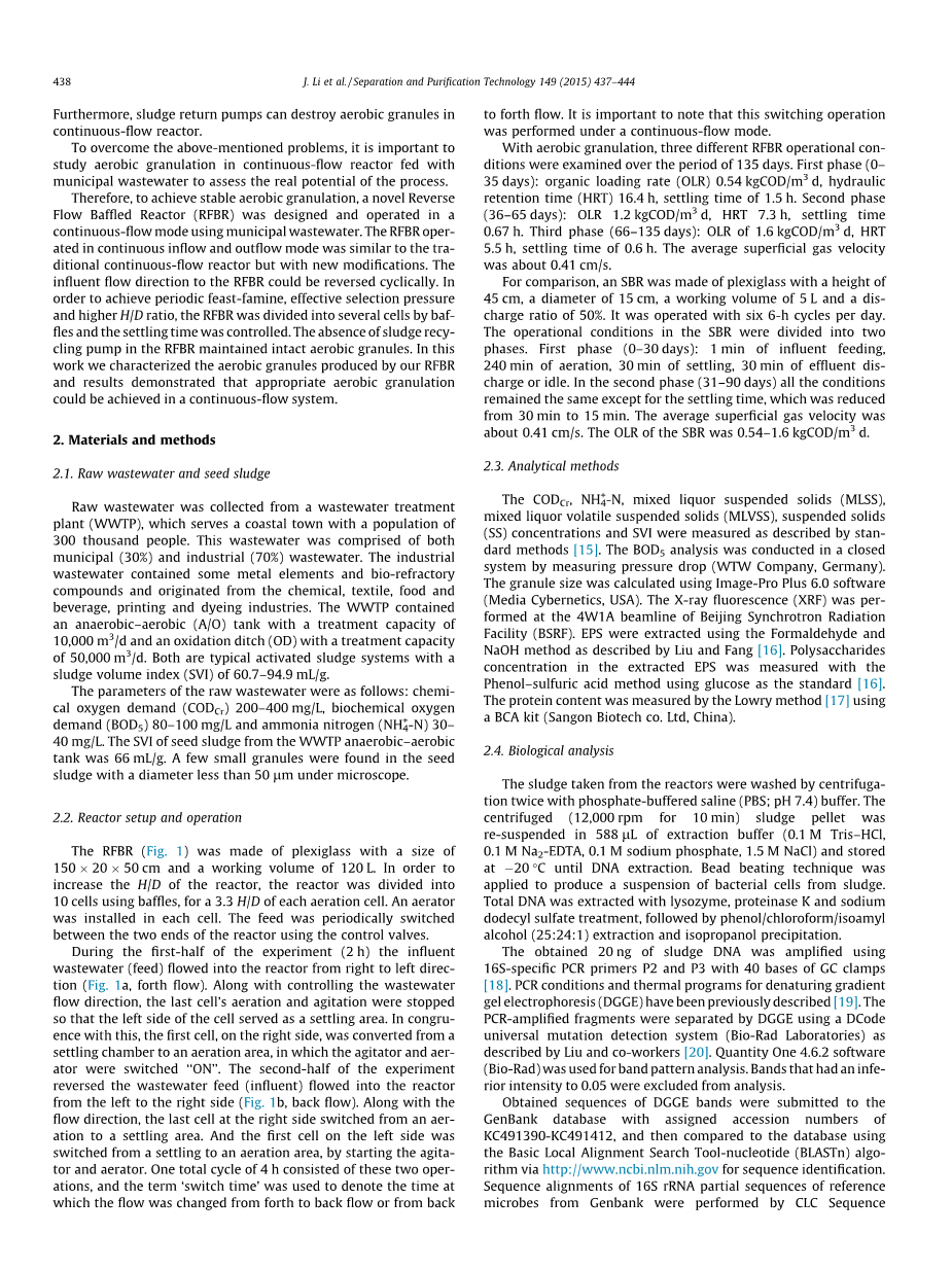 常见的废水处理过程存在菌株,允许处理较大量的废水。这种改进 - 连续流程可以解决许多卫生问题问题,特别是在发展中国家[4]。尝试在连续流程中培养好氧颗粒,已经不满意[8-10]。 2007年,李和同事在膜生物反应器中尝试需氧颗粒培养造粒是在连续流反应堆中的瓶颈。此外,污泥返回泵可以破坏好氧颗粒连续反应堆为了克服上述问题,重要的是在连续流反应器中研究好氧造粒市政废水评估过程的真正潜力。因此,要实现稳定的好氧造粒,一个新的反向流动反应器(RFBR)设计和操作在a使用城市污水的连续流模式。 RFBR操作 - 连续流入和流出模式类似于tra-连续流反应堆,但具有新的修改。该在RFBR的流向方向可以循环地反转。在为了达到定期的饥荒,选择压力有效和较高的H / D比,RFBR被baf-并且安定时间受到控制。没有污泥回收 - 保鲜泵在RFBR中维持完好的好氧颗粒。在这个我们的工作特点是我们的RFBR生产的好氧颗粒结果表明,适当的好氧造粒可以在连续流系统中实现。