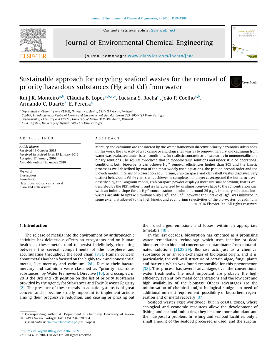 汞和镉被公认为水结构中优先考虑的有害物质。在这项工作中,对螃蟹甲壳和蛤壳废物从中除去汞和镉的能力进行批次条件下评估,用于单金属和二进制解决方案。结果证明,在单金属解决方案中并在研究运行条件下,两种生物吸附剂都可以实现高于80%的Hg2 去除效率,而且动力学过程可以由两个最广泛使用的方程,伪二阶和埃洛维奇模型来进行描述。在生物吸附平衡方面,螃蟹甲壳和蛤壳废物显示非常不同的行为。虽然蛤壳完成单层覆盖并且等温线能很好的由Langmuir模型描述,螃蟹甲壳粉显示更不寻常的行为,使用BET等温线描述,其特征在于与浓度轴呈几乎凸起的形状,对于约25mg / L的溶液中的Hg2 浓度具有无限斜率。二进制解决方案废物能够同时吸收Hg2 和Cd2 ,但Hg2 的摄取受到抑制在一定程度上归因于镉生物废物的高动力和平衡选择性。
