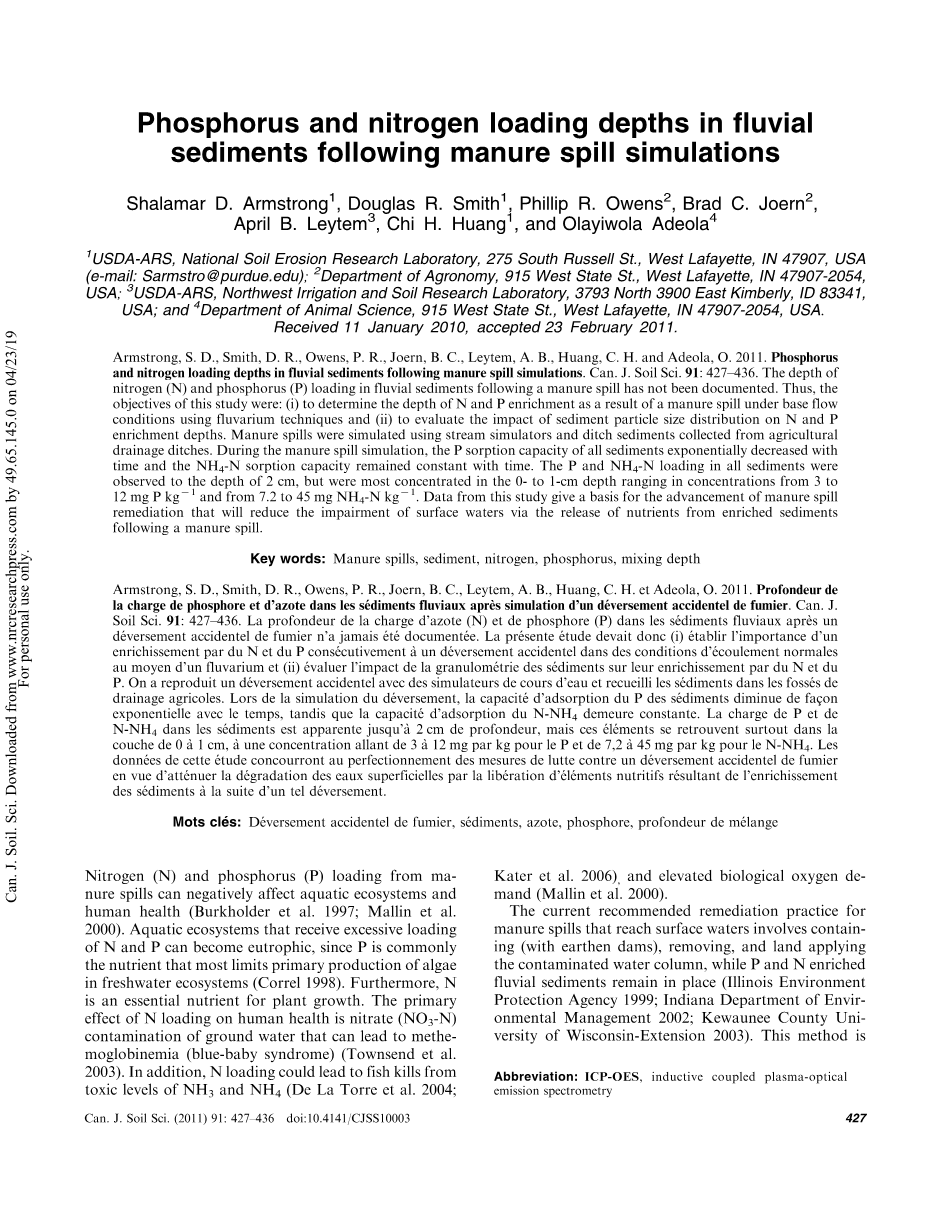 粪便泄漏模拟后的泥质沉积物中的磷和氮负荷深度Shalamar D. Armstrong1, Douglas R. Smith1, Phillip R. Owens2, Brad C. Joern2, April B. Leytem3, Chi H. Huang1, and Olayiwola Adeola4