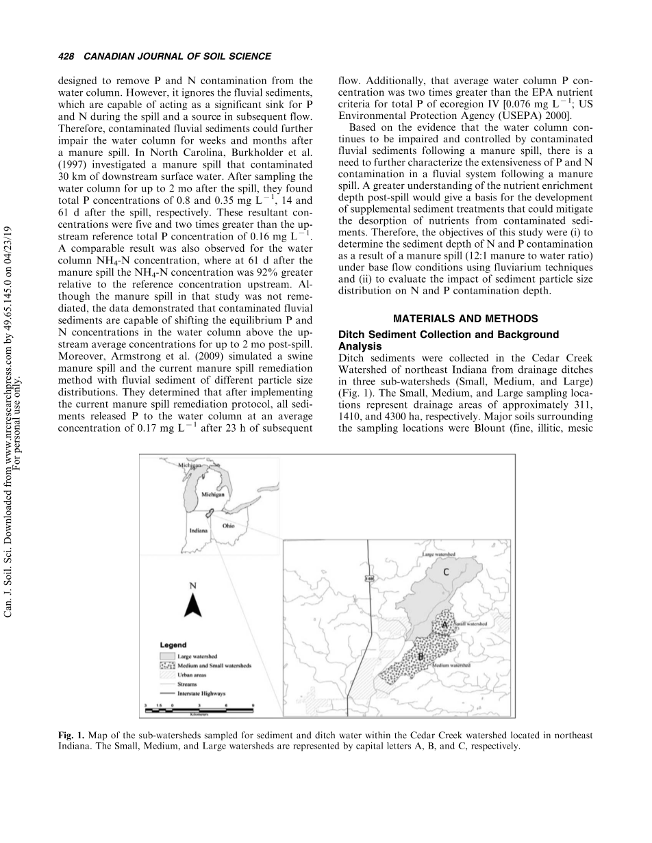 在印第安纳州东北部的Cedar Creek流域,从三个小流域(小,中,大)的排水沟收集沟渠沉积物(图1)。 小型,中型和大型采样位置分别代表大约311,1410和4300公顷的排水区域。采样点周围的主要土壤是布朗特(精细,伊利石,mesic Aeric Epiaqualfs); Pewamo(精细,混合,活跃,mesic Typic Argiaquolls)和Glynwood(精细,mesic Aquic Hapludalfs)[USDA-国家资源保护局(USDA-NRCS)2002]。在土壤剖面的前23厘米内,布朗特土壤CEC的范围为9至21 meq100 g- 1,pH范围为5.6至7.3。 Pewamo和Glynwood土壤的CEC分别为18至39和10至21 meq 100 g- 1土壤,土壤pH值范围为5.6至7.3(USDA-NRCS 2002)。 Blount,Pewamo和Glynwood土壤最常见的坡度分别为 1 -4%,0 -1%和3 -6%(USDA-NRCS 2002)。在小流域内,布朗特(72%)和Pewamo(22%)占排水面积的94%,在中等流域,两个土壤占排水面积的72%(布朗特52%,Pewamo 20%)。 在大流域内,布朗特(27%),Pewamo(21%)和Glynwood(14%)土壤占排水面积的62%。