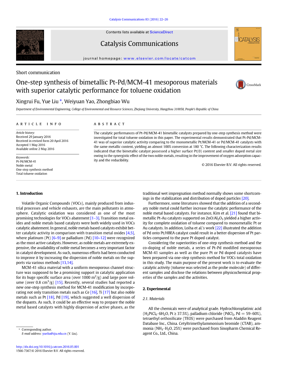 Keywords:Pt-Pd/MCM-41;Noble metal;One-step synthesis method;Total toluene oxidation